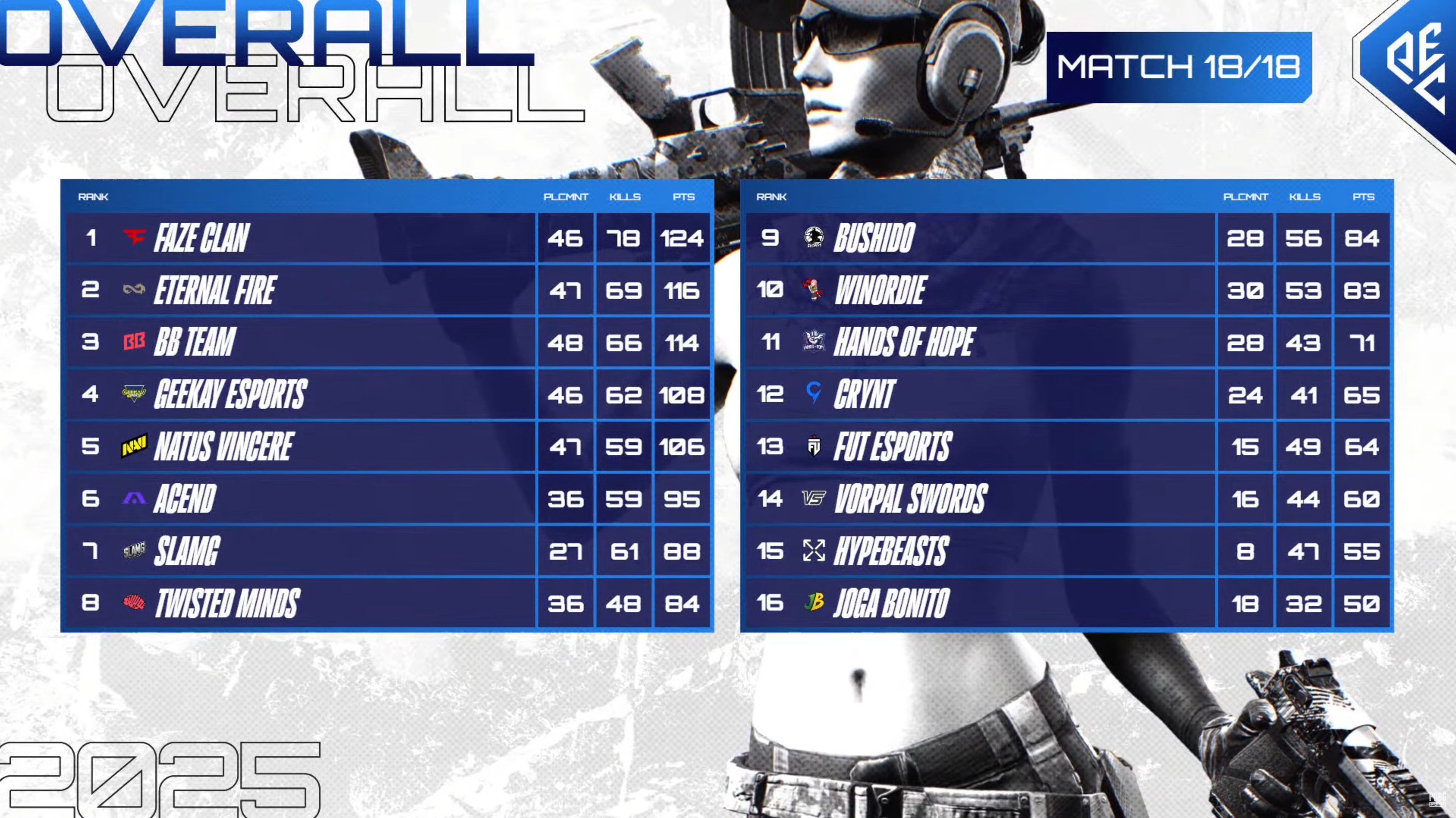 FaZe Clan, Eternal Fire, BB Team, Geekay Esports, Natus Vincere, Acend, SLAMG, Twisted Minds