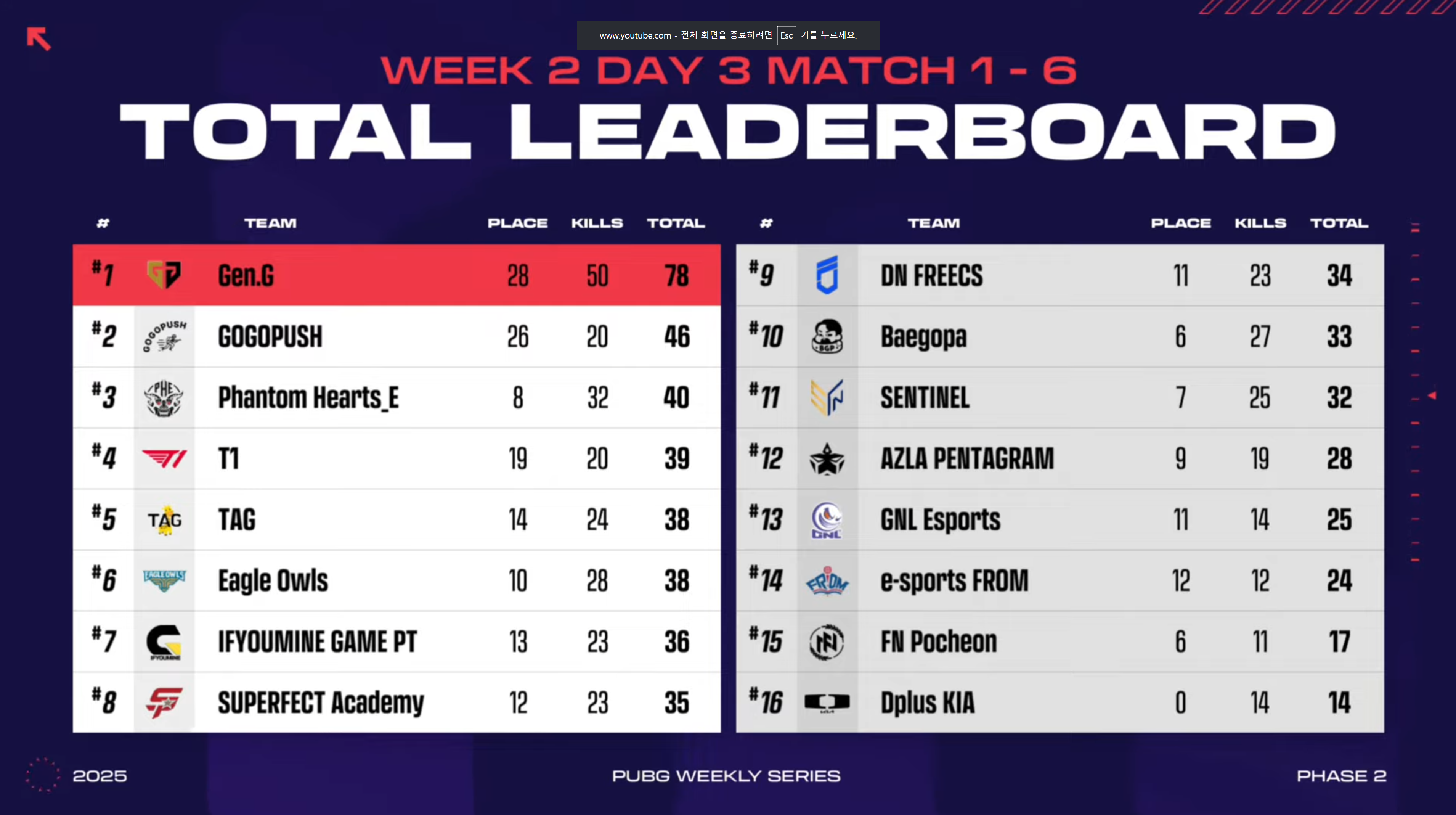 DN FREECS led the way with back-to-back 90+ point days, but Gen.G responded on the final day with 78 points to balance the rivalry. The two teams clearly established themselves as the frontrunners in Week 2.