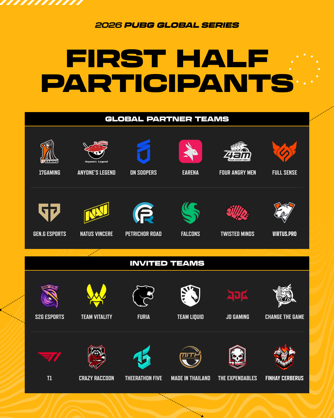 We're excited to announce the 24 teams competing in the first half of the 2026 PUBG Global Series!