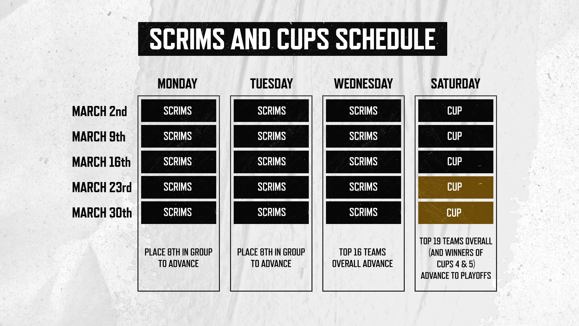 Each week kicks off with three days of scrims, which take the form of an elimination bracket. Scrims are all about survival - teams will be eliminated from scrims each day, almost like a weekly mini-tournament! At the end of the third day, only the top 16 teams will make it to the weekend Cup.