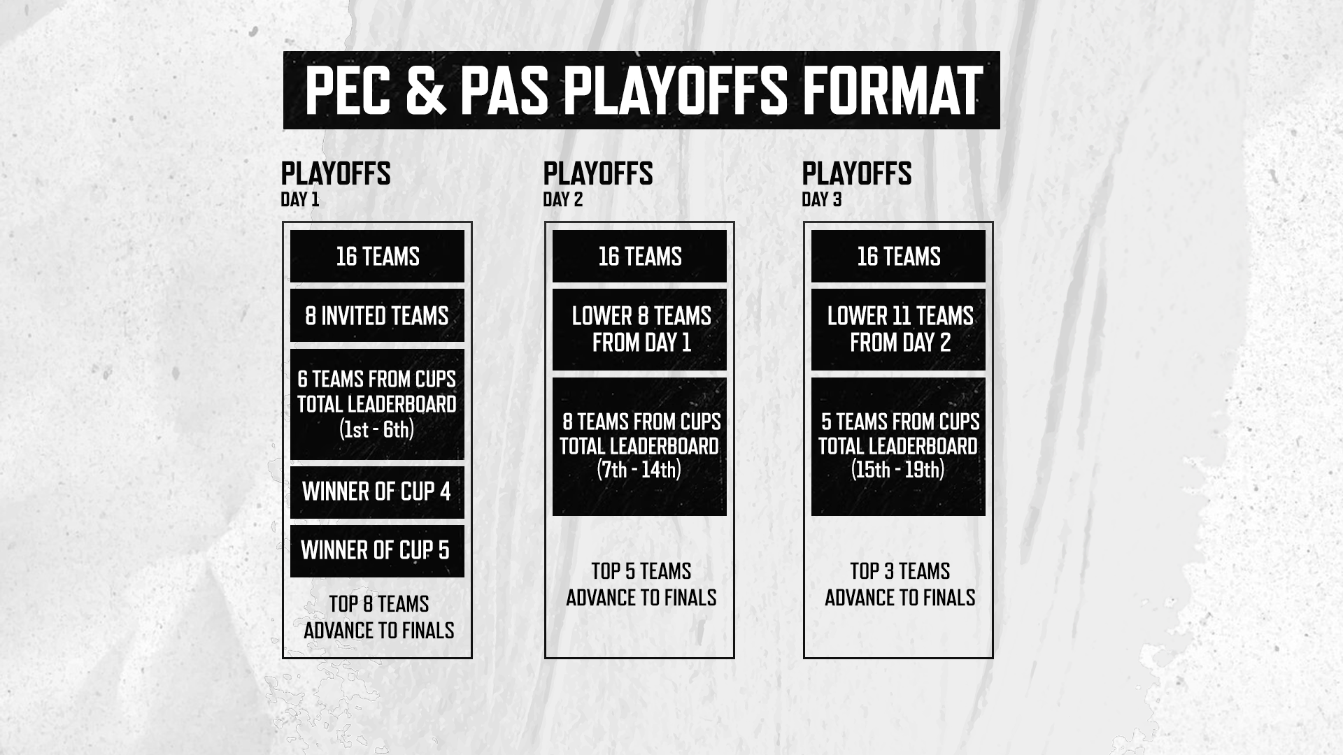 Teams are seeded to start their Playoffs journey on certain days based on their previous performance. For example, the team who ended 3rd on the Cups leaderboard would start their Playoffs journey on Day 1 (and would therefore have three chances to qualify, with three days of play ahead of them). By contrast, the team who finished 18th on the Cups leaderboard would still make it to the Playoffs, but would enter on Day 3 - giving them only one chance to qualify for the Finals.