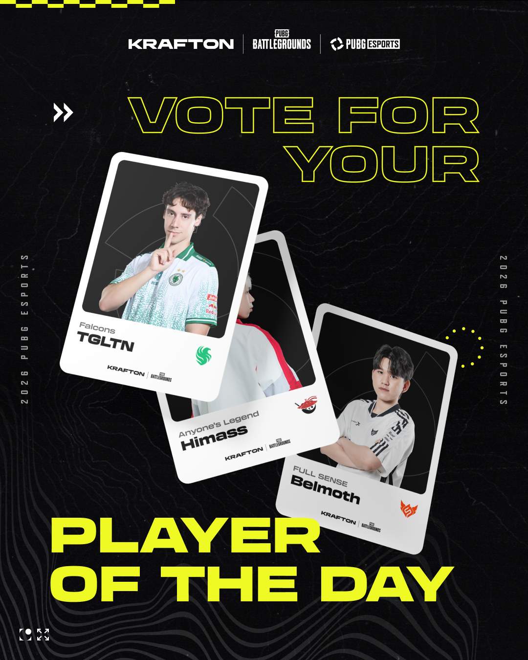 Player of the Day is a fan-driven spotlight that runs during every Tournament's Final Day broadcast. While the players battle it out on the biggest stage, you'll have the chance to cast your vote for the one player who left the biggest impression — and your pick will be officially recognized by PUBG Esports.