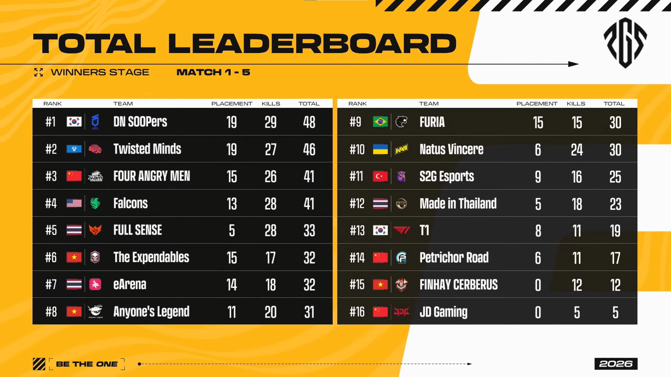 Winners Stage (Day 1): DN SOOPers claimed 1st place with 48 points, securing 10 Advantage Points heading into the Final Stage. Twisted Minds (46 pts) rose to 2nd, while Four Angry Men and Team Falcons tied at 41 points for 3rd and 4th.