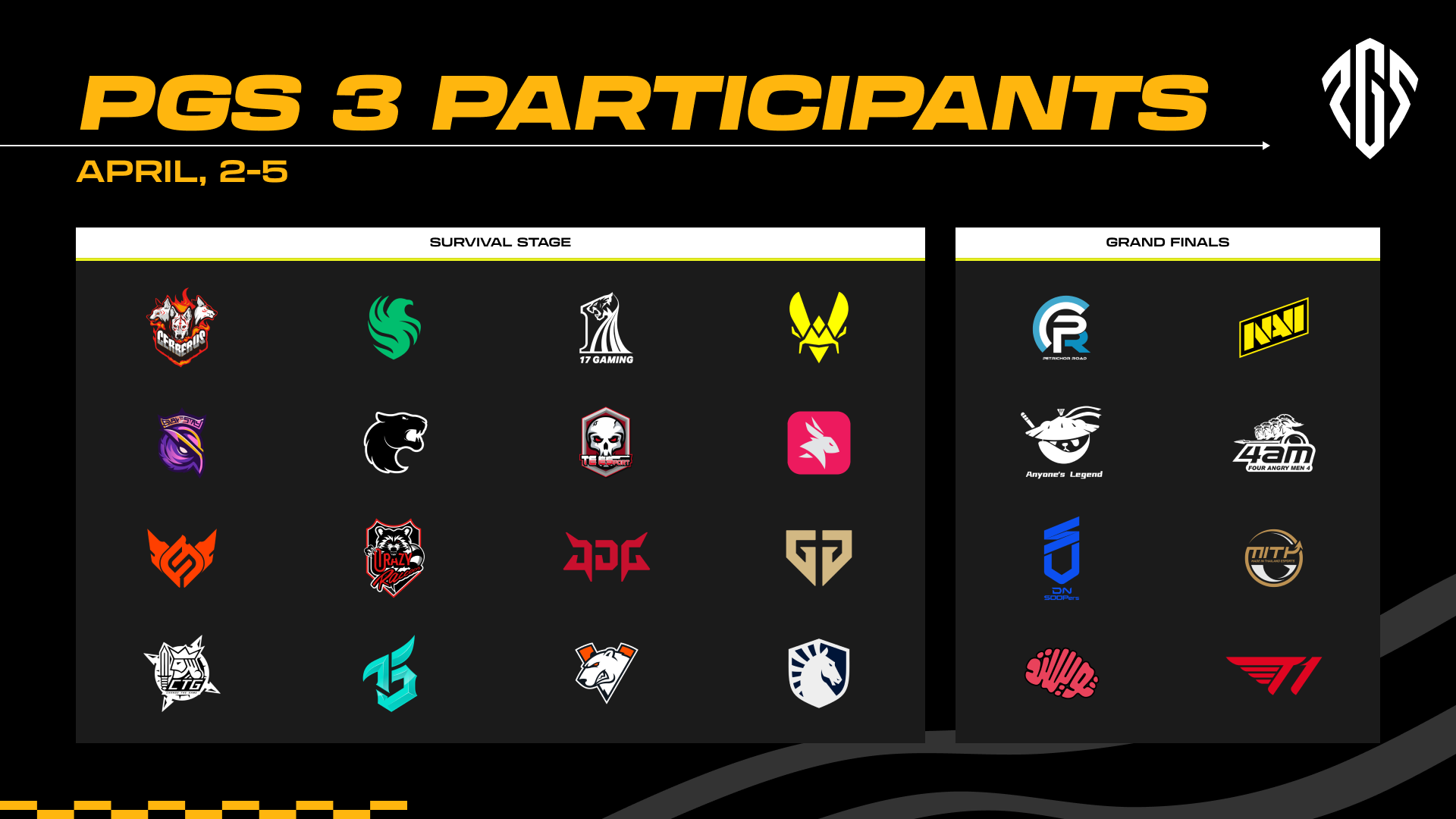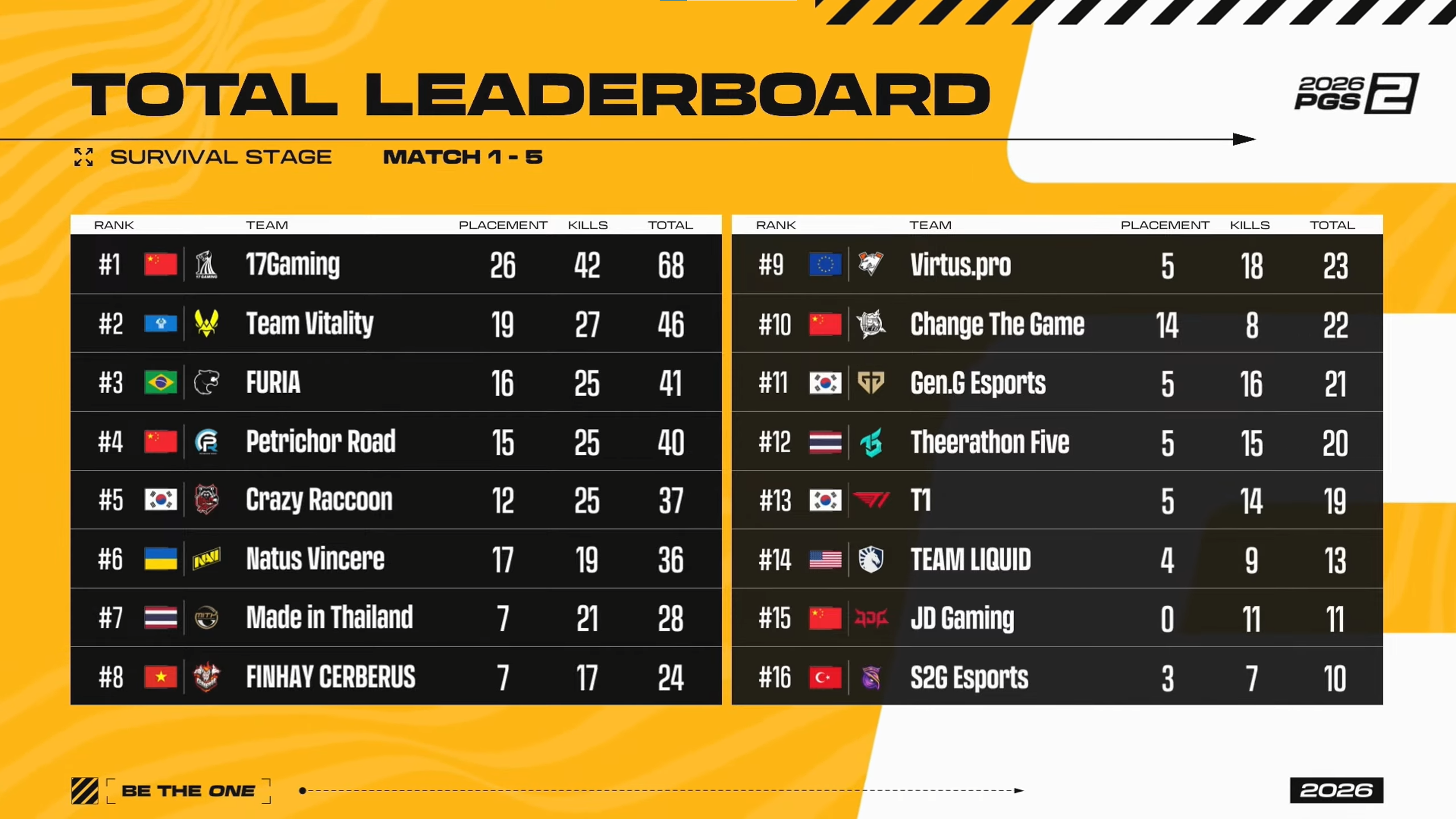 The bottom 8 teams (FURIA, Natus Vincere, S2G Esports, Made in Thailand, T1, Petrichor Road, Finhay Cerberus, JD Gaming) joined the 8 teams eliminated from PGS 1 in the Survival Stage.