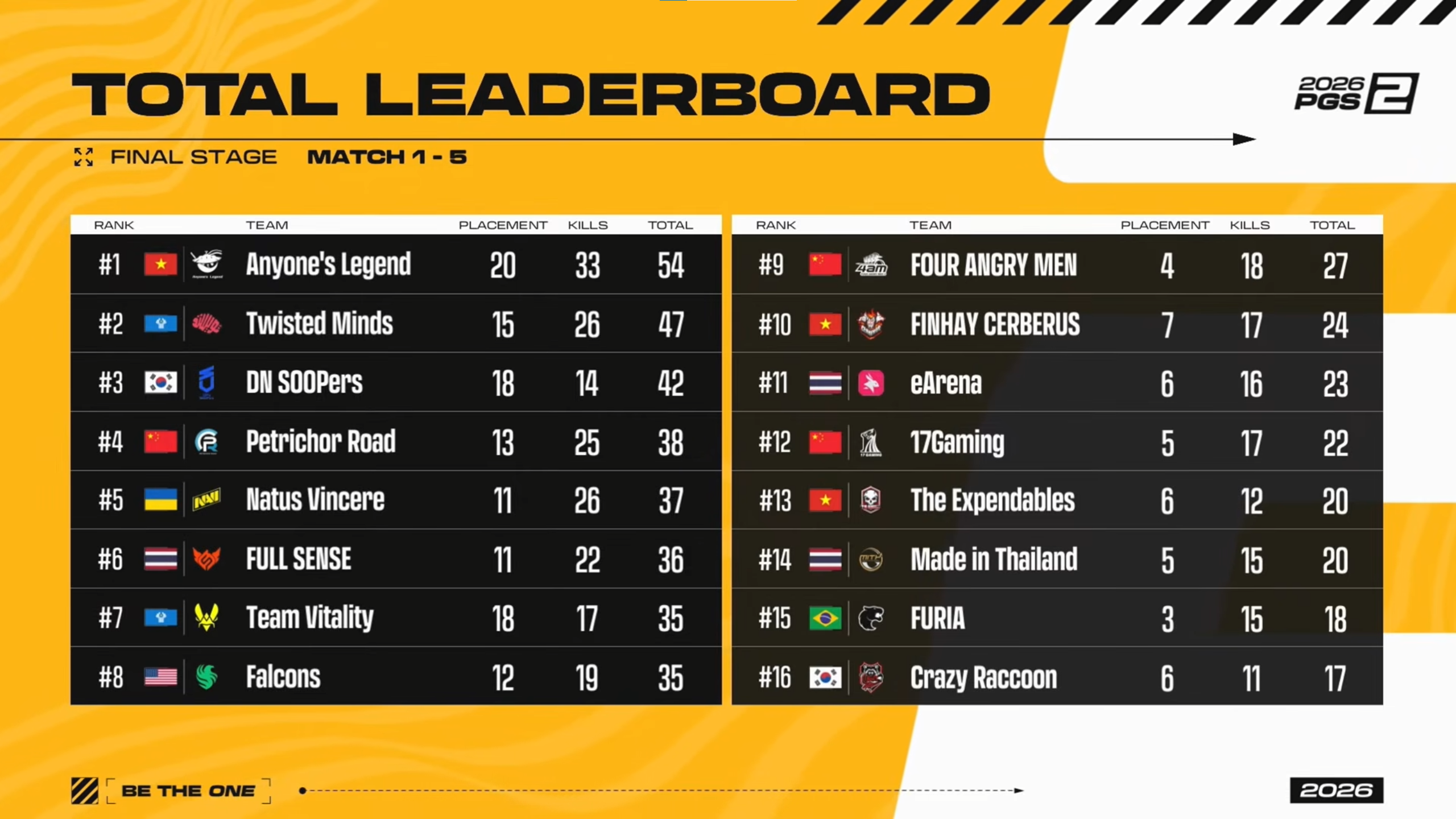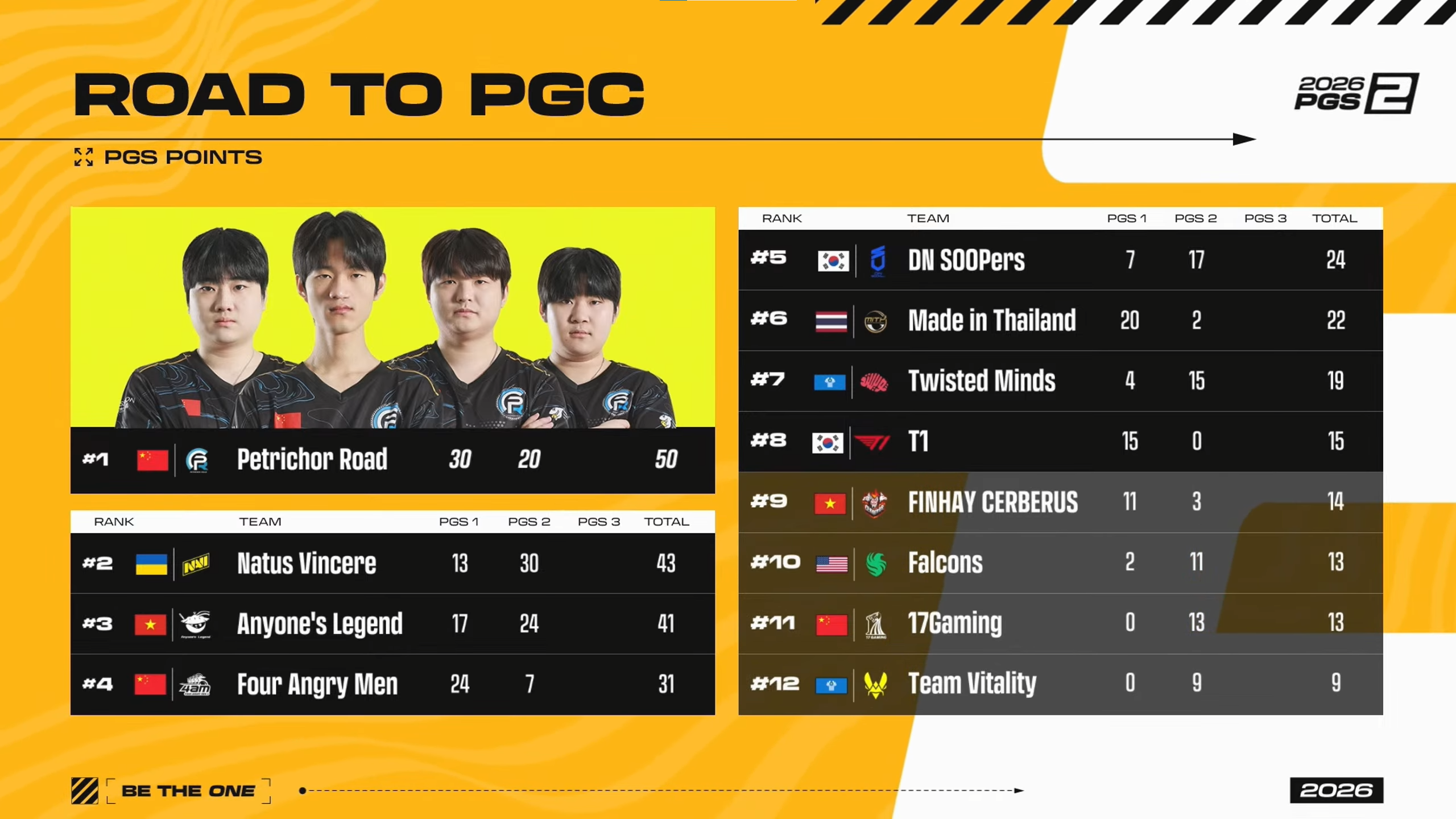PGS 1 champions Petrichor Road plummeted to 14th, and JD Gaming finished last with 0 placement points.
