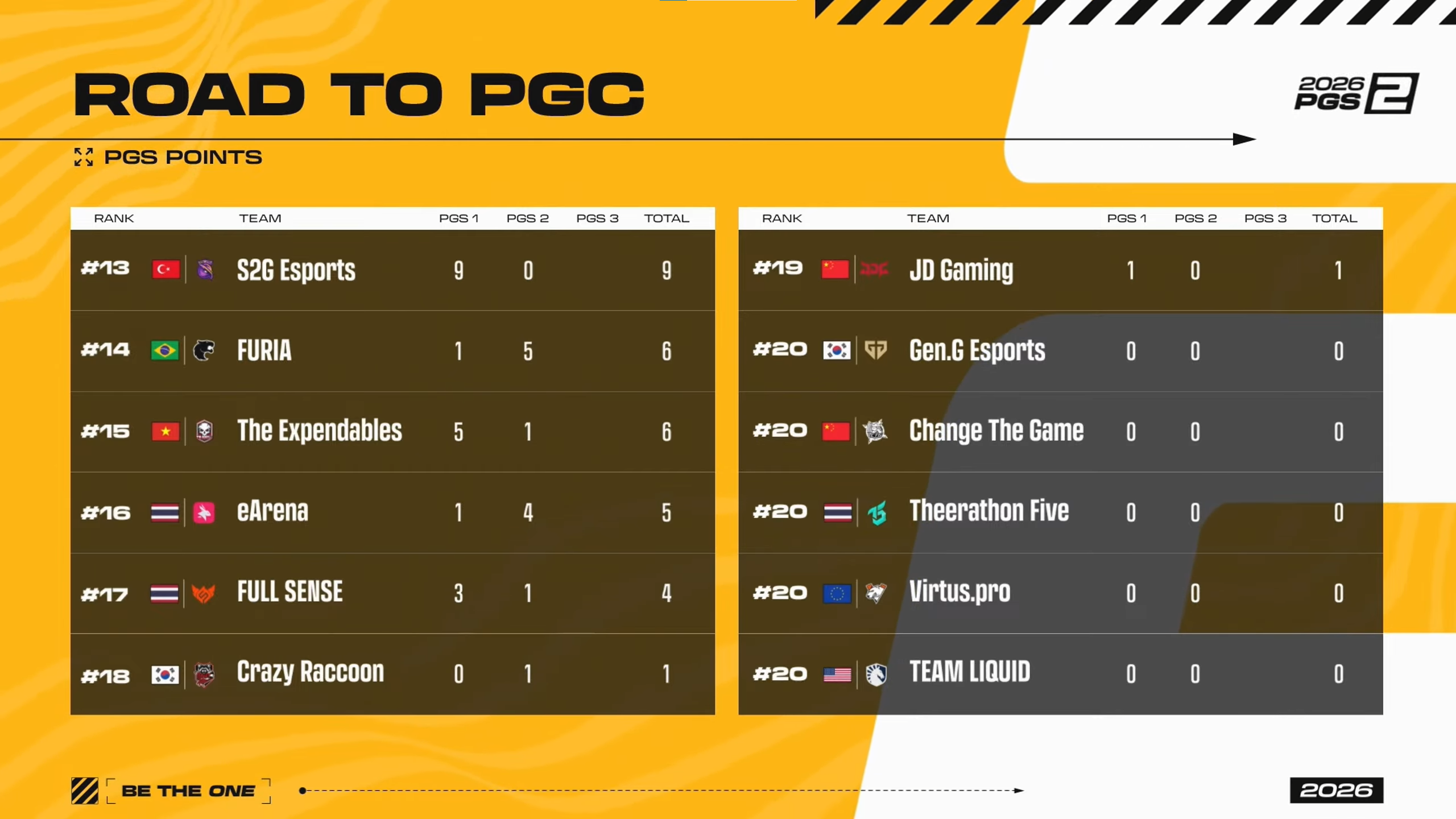 Virtus.pro , Change The Game, Gen.G Esports, Theerathon Five, T1, Team Liquid, JD Gaming, and S2G Esports were eliminated from PGS 2.