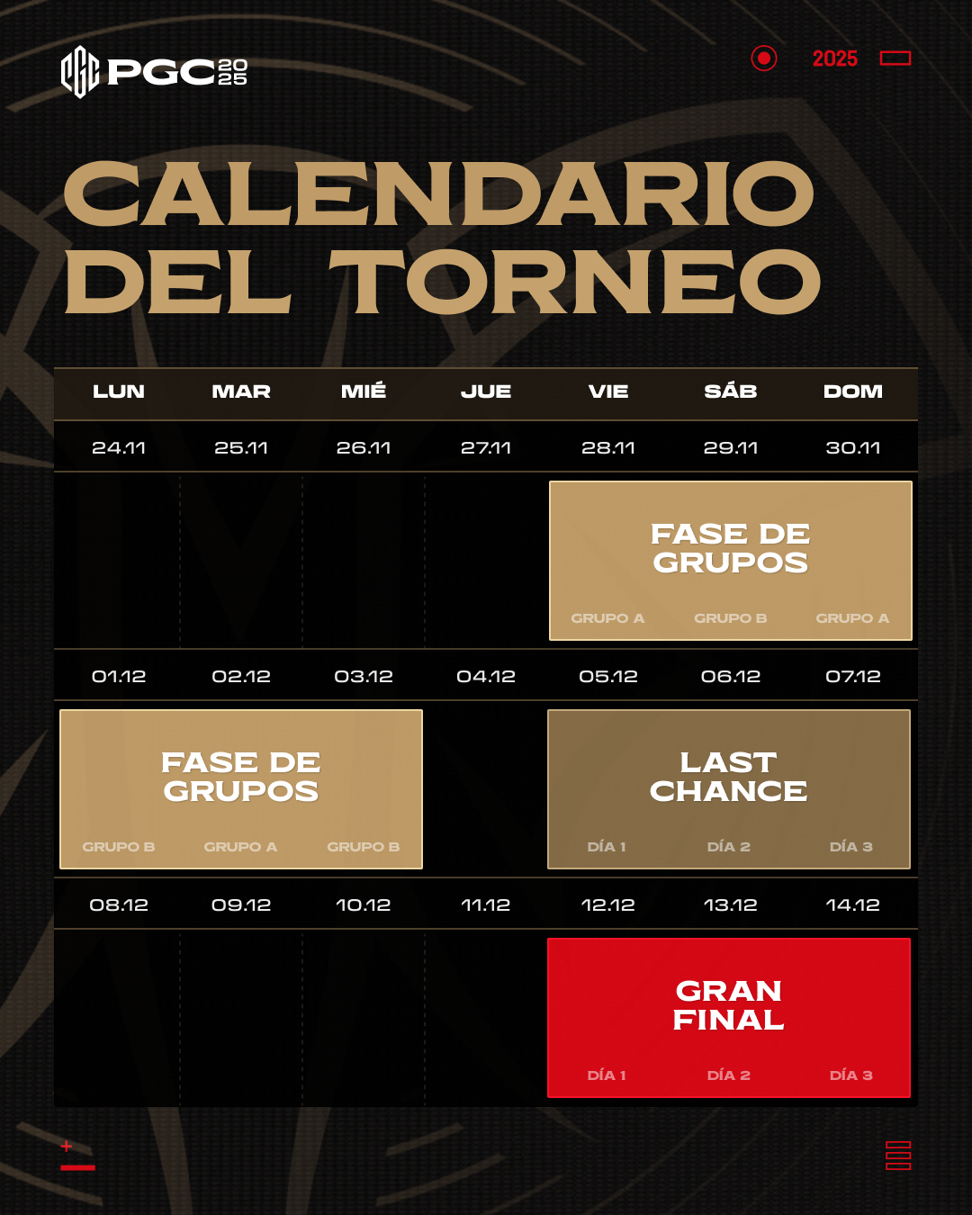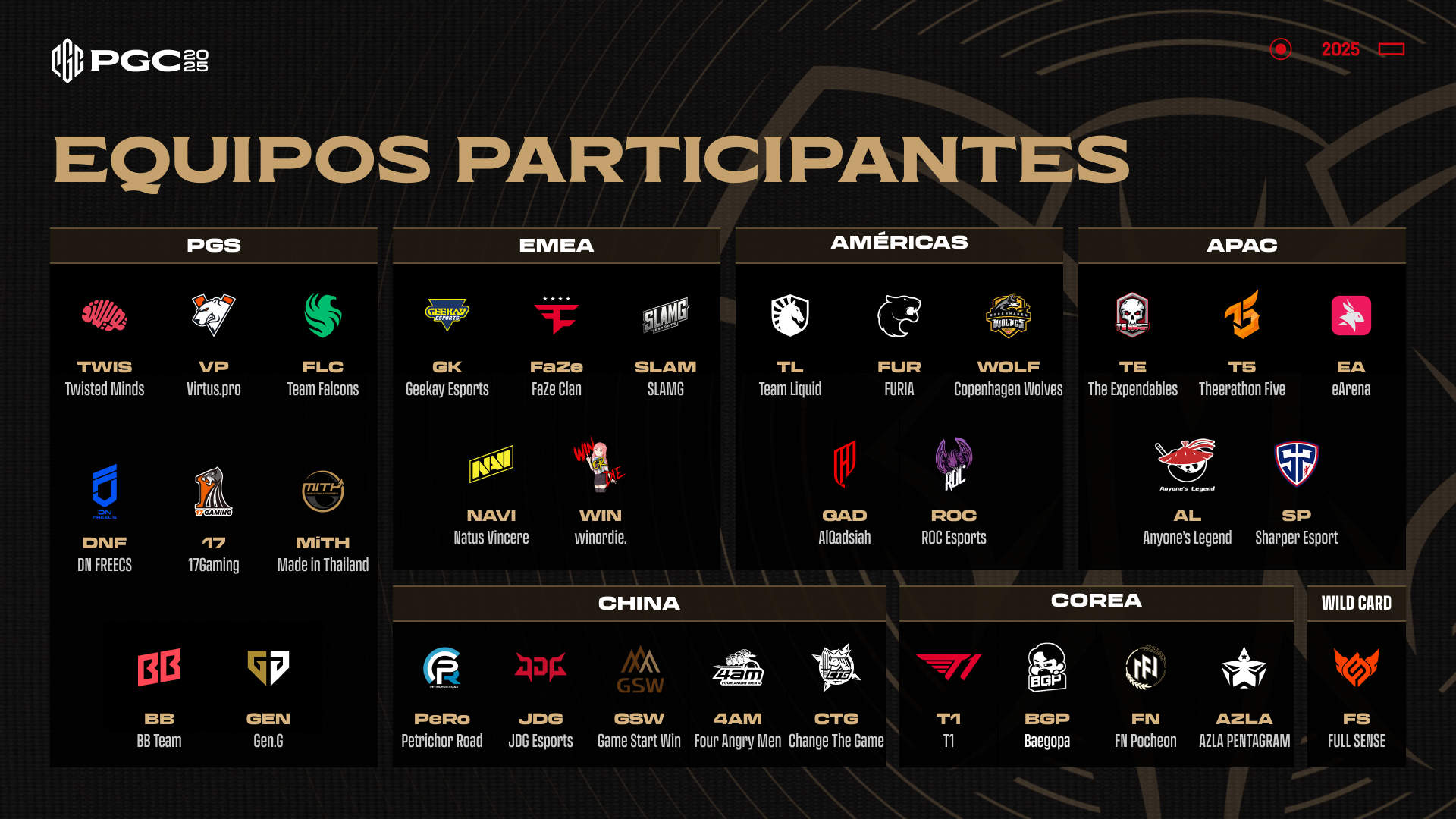 Durante la temporada 2025, equipos de todo el mundo compitieron intensamente en cuatro PGS, sumando valiosos puntos para la clasificación mundial. Y no lo olviden: ¡otros equipos también se han asegurado su plaza en la PGC a través de sus respectivas series regionales en EMEA, América, APAC, China y Corea, además de un equipo comodín de la región anfitriona!
