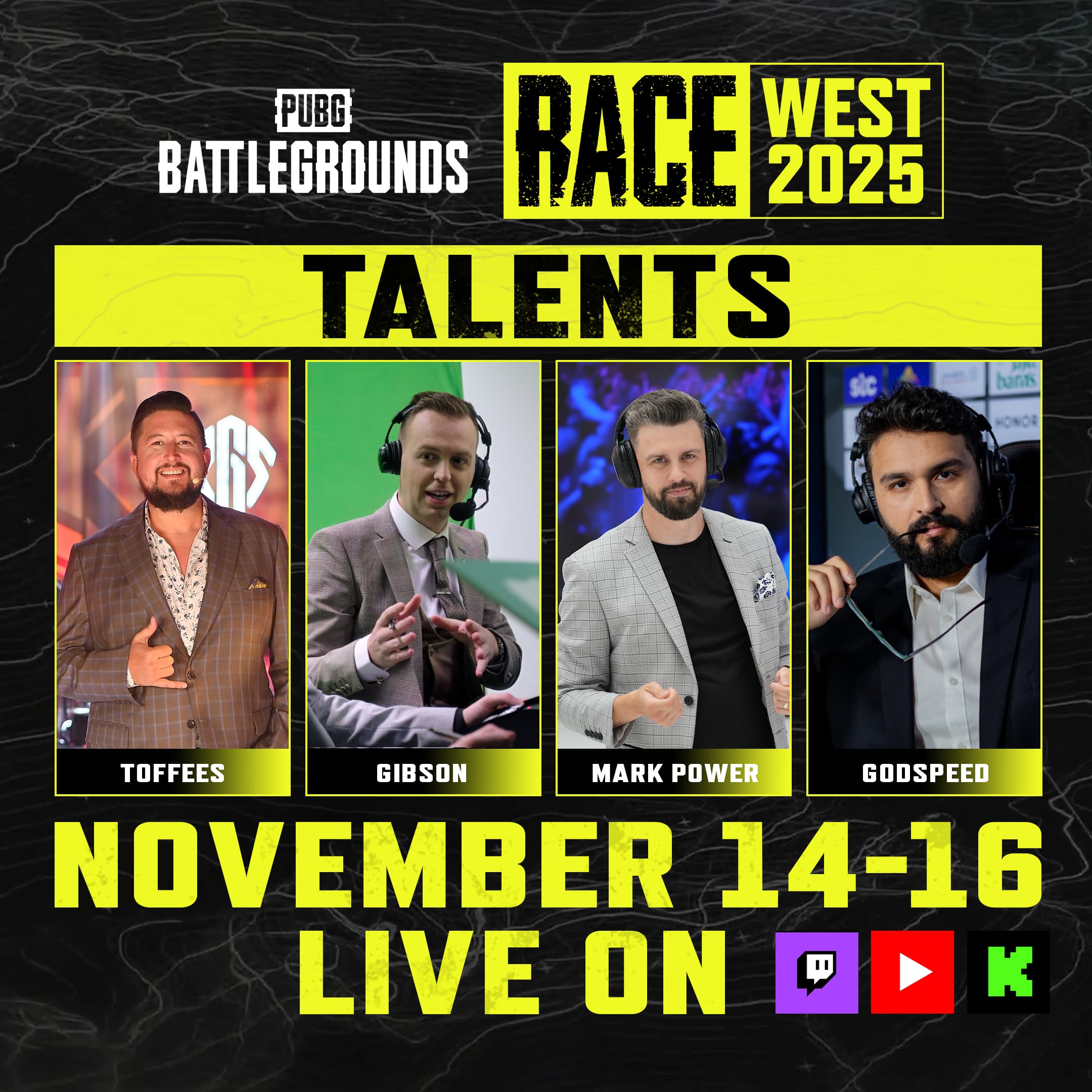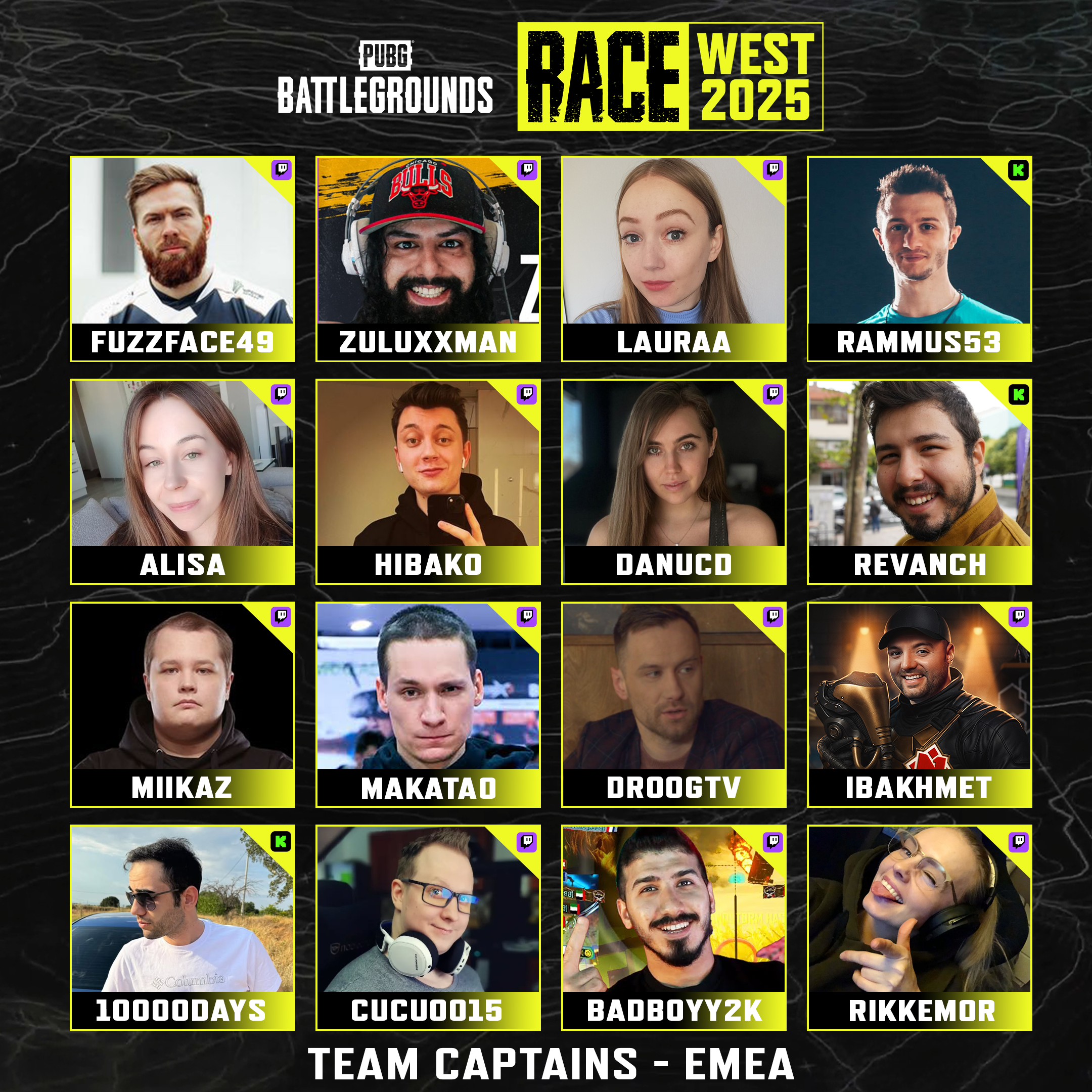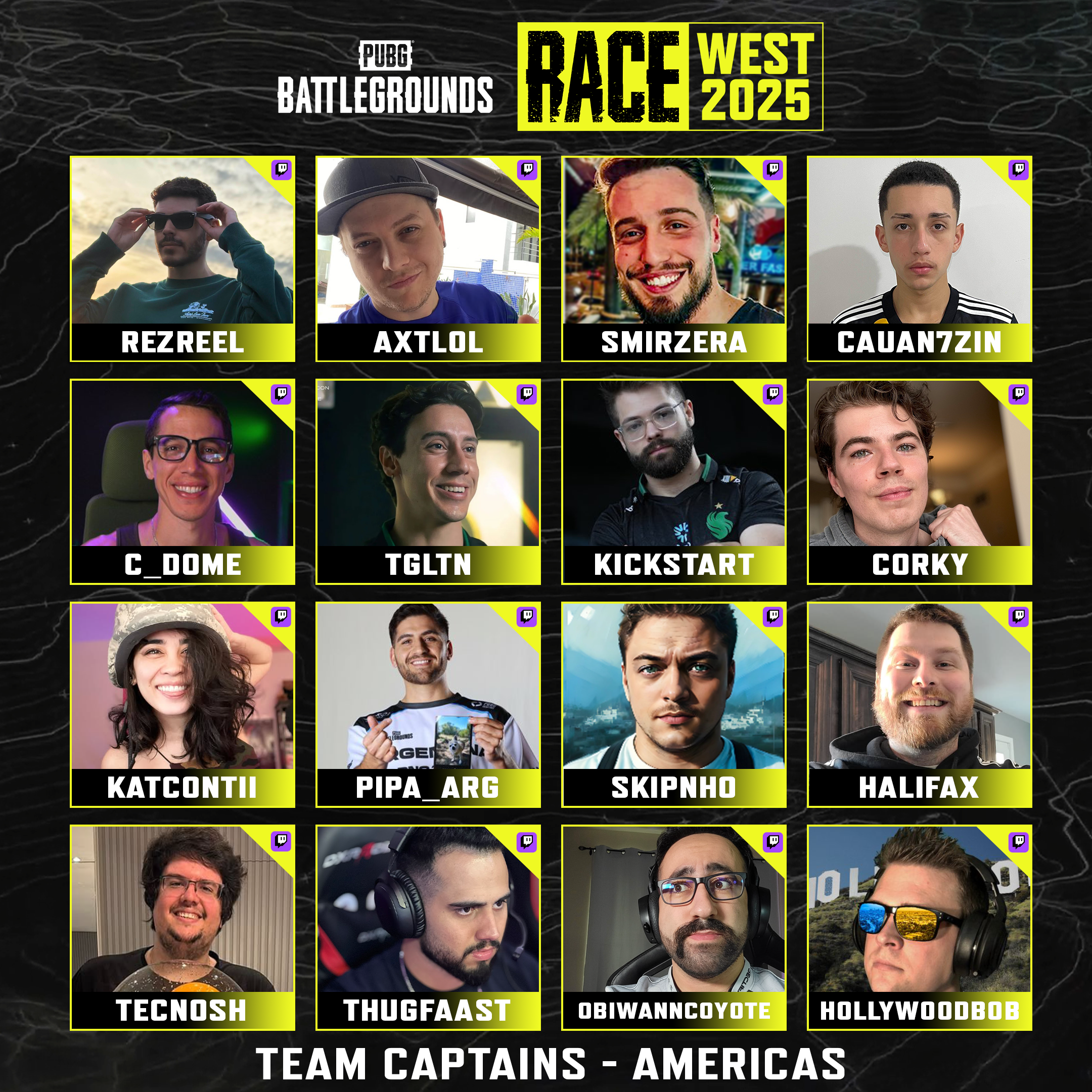 Treinta y dos creadores de contenido de PUBG serán los capitanes en este torneo lleno de acción. Junto a jugadores profesionales y otros streamers de EMEA y de las Américas, todos transmitirán la emocionante competencia que es PUBG Race: West 2025. ¡Serán 128 transmisiones que podrás seguir a lo largo del fin de semana!