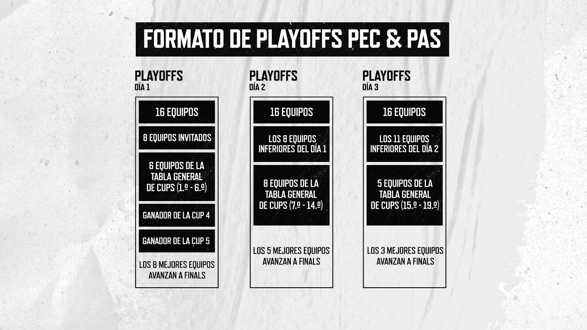 En total, 19 equipos avanzarán a los Playoffs desde las Cups semanales. Una mejor posición final en la tabla general de Cups te dará más días de competencia en Playoffs y más oportunidades de clasificar.