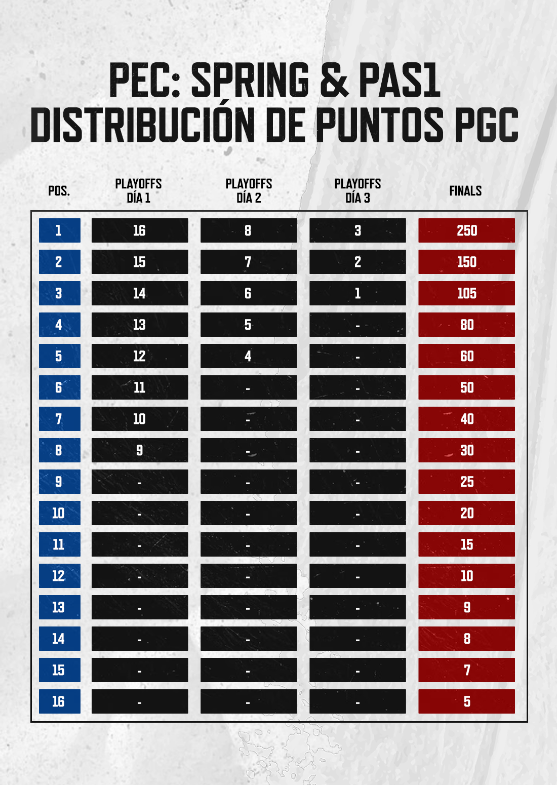 Con dos bloques de Playoffs y Finals, habrá muchas oportunidades para sumar PGC Points. Clasificar a las Finals desde los Playoffs otorgará a tu equipo una cantidad pequeña de puntos (según qué tan temprano hayas clasificado), pero también será necesario rendir bien en las Finals si quieres asegurar tu lugar en el PGC. Así es como se verá la distribución: