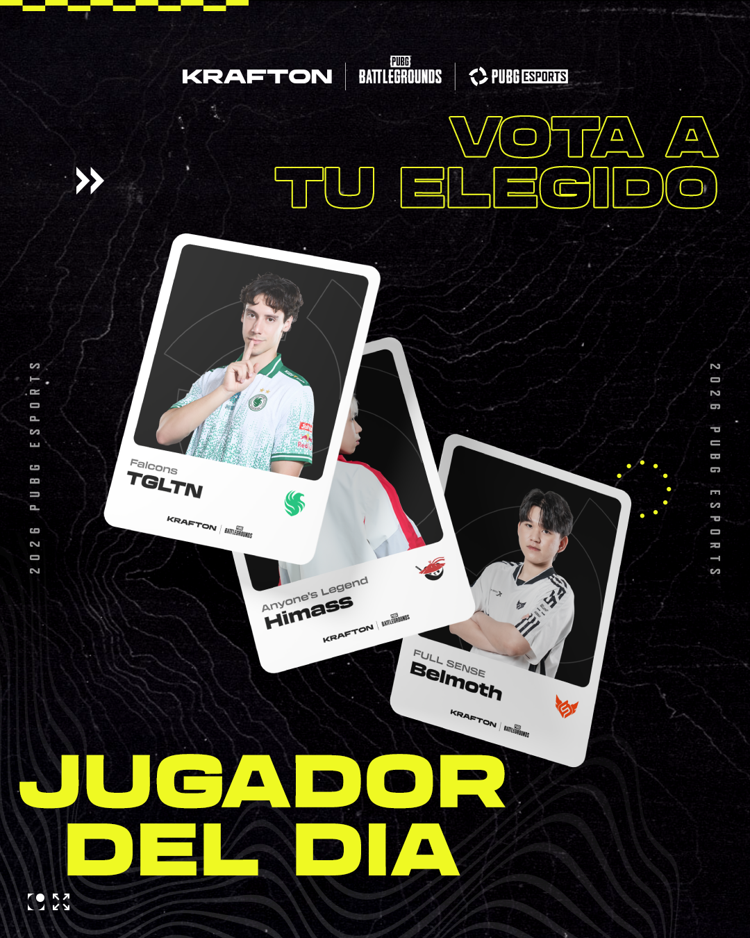 El Jugador del Día es un reconocimiento impulsado por los fans que ocurre durante la transmisión del Día Final de cada torneo. Mientras los jugadores compiten en el escenario, tendrás la oportunidad de votar por el jugador que más te impresionó — y tu elección será reconocida oficialmente por PUBG Esports.