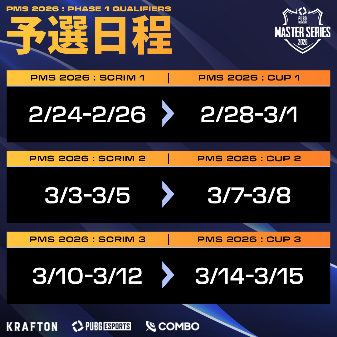 PUBG MASTER SERIES 2026: PHASE 1のエントリー受付が本日より開始されたことをお知らせいたします!今年のPUBG MASTER SERIESはいくつのアップデートがございます。まずはTPPへの移行、そしてタイとベトナムとの世界大会予選(APAC QUALIFIERS)が廃除され、最後にPHASEごとの賞金総額が50,000ドルに増加しました。選手に今までにない熱い競技ステージをを提供します。