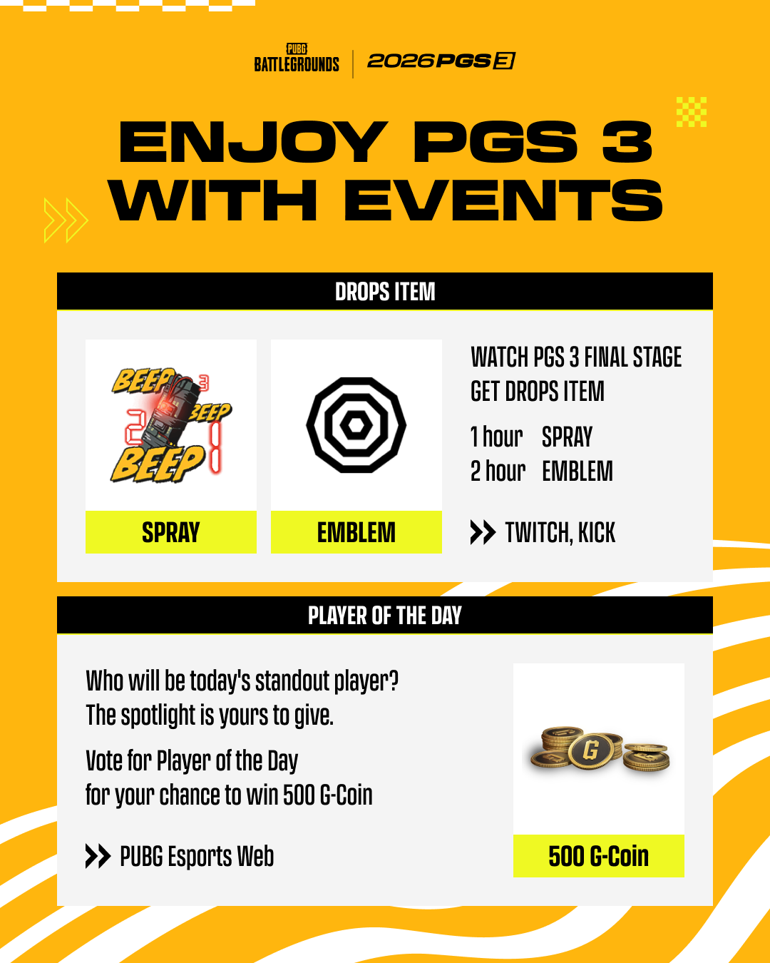 また、お楽しみは試合だけではありません。PGS 3 グランドファイナル最終日(4月5日)には、「Drops(ドロップス)」と「Player of the Day」投票の両方があなたを待っています!詳細は以下をご確認ください。