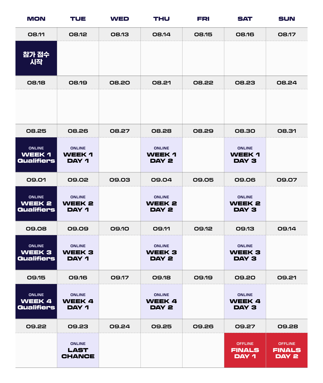 • 4주 차에 제출한 로스터로 Last Chance 및 Finals 경기도 참여해야 합니다. 4주 차 로스터 제출 이후 Last Chance 및 Finals 경기를 위한 로스터 추가 제출 및 변경은 불가합니다.