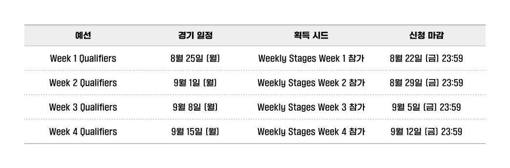 (Weekly Stages 누적 포인트 상위 16위 팀은 다음 주 차 Weekly Stages 참가를 위한 예선 경기 참여가 불가합니다.)