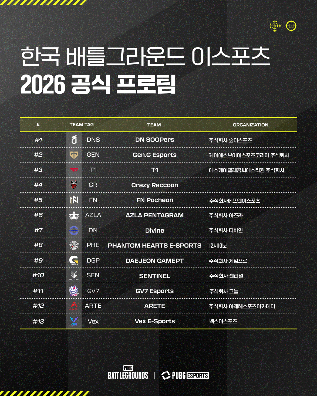 < 2026 한국 배틀그라운드 이스포츠 공식 프로팀 >