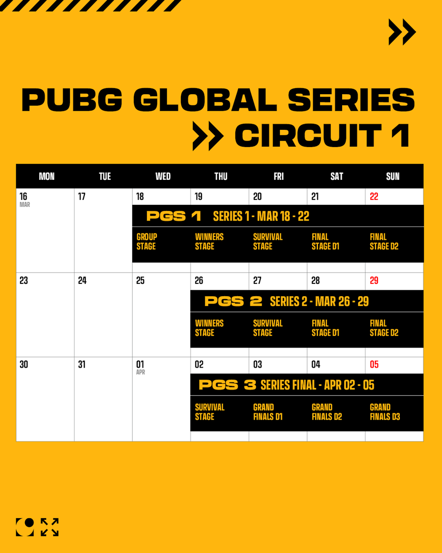 이번 첫 번째 서킷, 펍지 글로벌 시리즈 1 - 3은 대한민국 서울특별시 성수동에서 무관중으로 개최되며, 전 세계 24개 팀이 3주에 걸쳐 격돌합니다. 매주의 성적이 다음 주로 이어지며, 최종적으로 2026년 첫 번째 서킷 챔피언이 가려집니다.