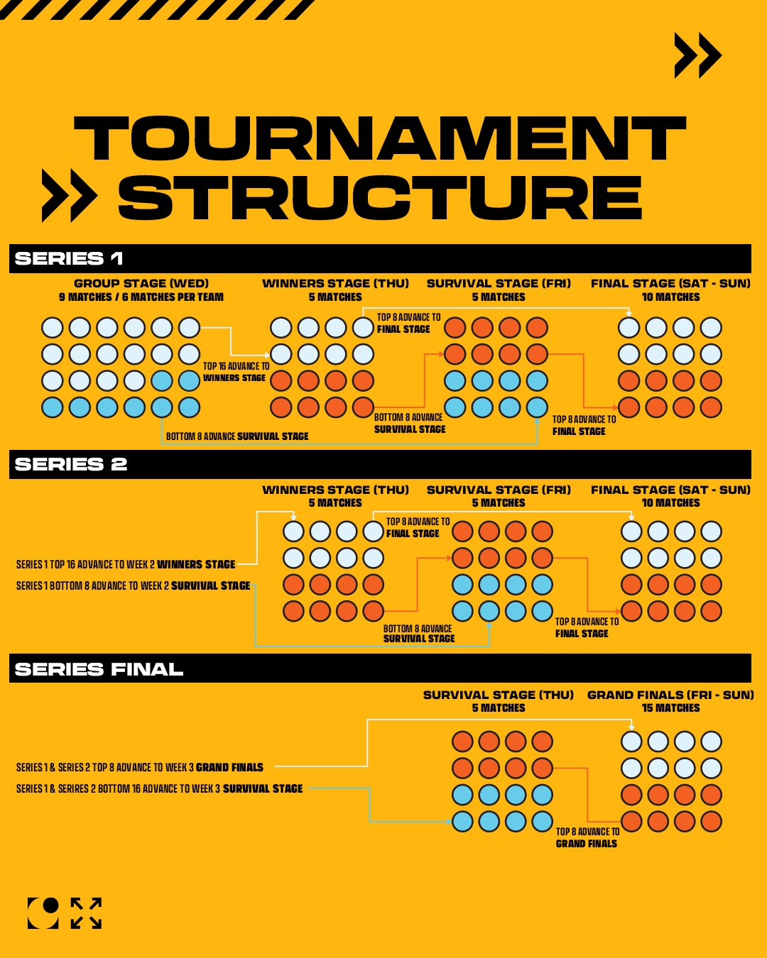 - 파이널 스테이지 (토–일요일): 16개 팀이 10매치를 통해 시리즈 1 최종 순위를 결정합니다.