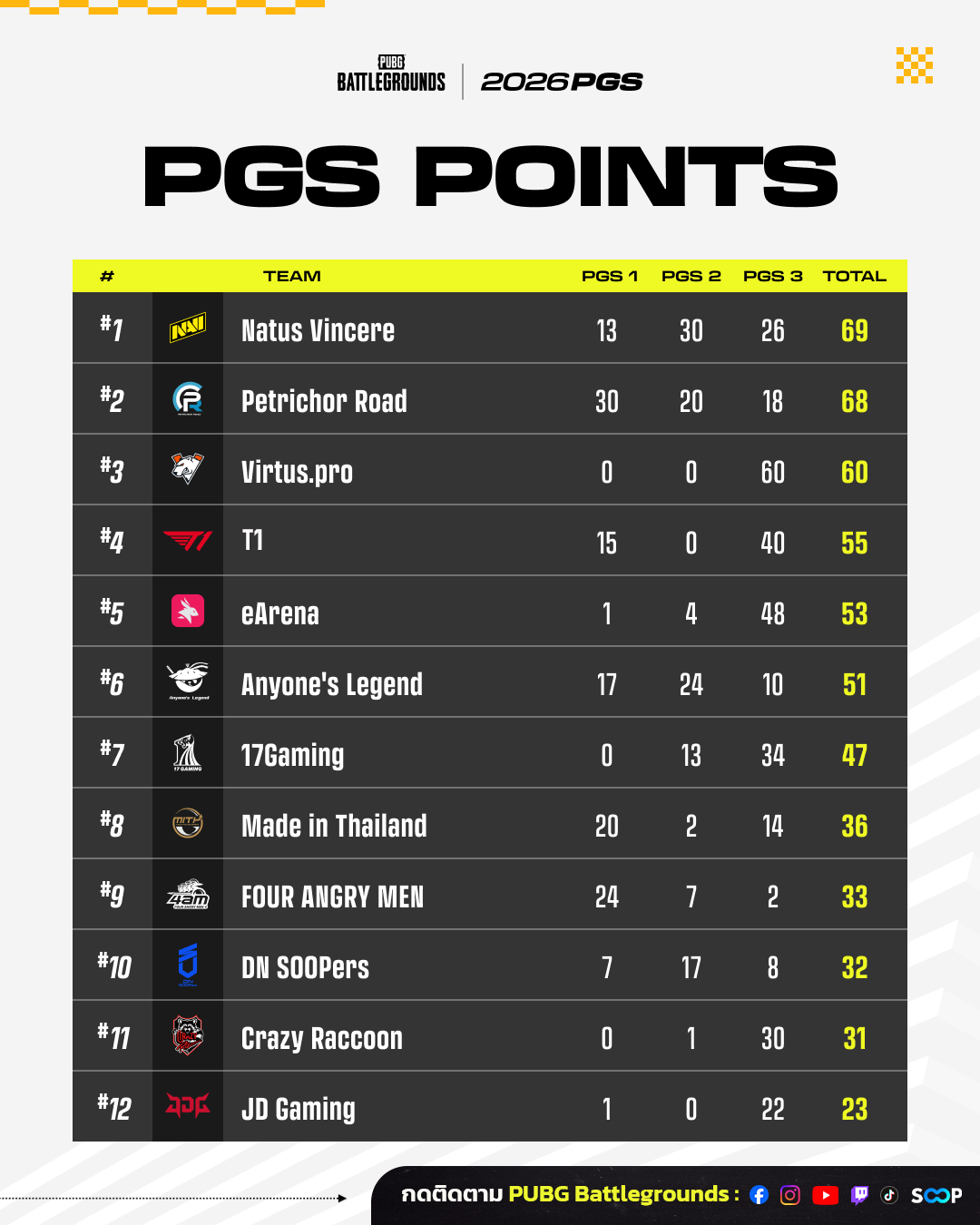 นี่คือ 12 ทีมอันดับสูงสุดในตาราง PGS Points จาก Circuit 1