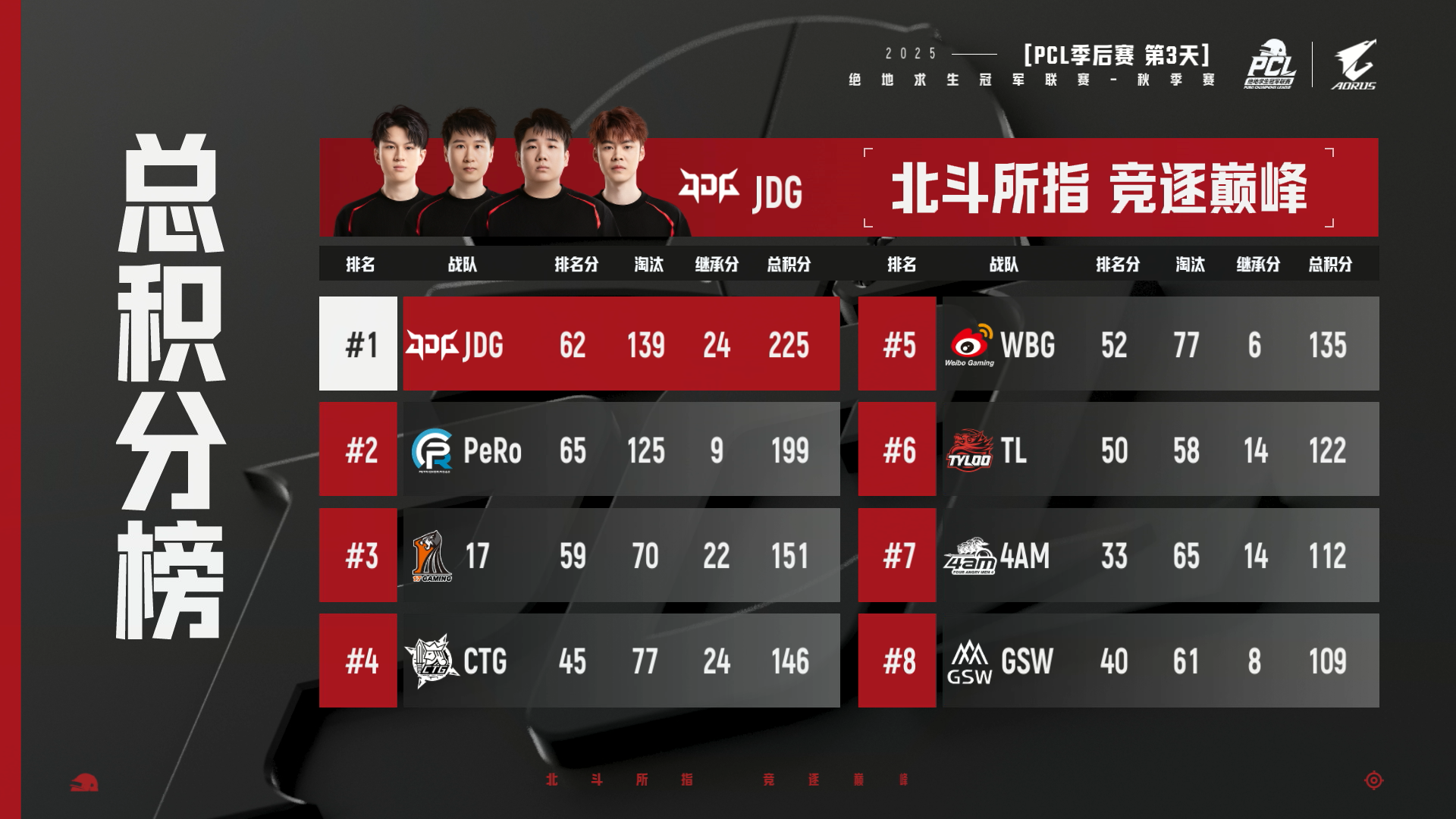 สรุป: แต่ละวันมีทีมผู้ชนะต่างกัน แสดงให้เห็นถึงความสูสีของลีก APAC โดย FULL SENSE ทำผลงานวันสองได้อย่างยอดเยี่ยม (95 แต้ม, 3 WWCDs) จากการเก็บแกนหลักของ Daytrade Gaming เอาไว้ ขณะที่ Buriram United Esports โดดเด่นในวันสุดท้าย และ Forest Natural Gaming สร้างผลงานสม่ำเสมอจนคว้าตั๋ว PGS สุดท้ายไป ในที่สุด FULL SENSE, Buriram United Esports และ Forest Natural Gaming คือตัวแทนที่ได้ตั๋ว PGS