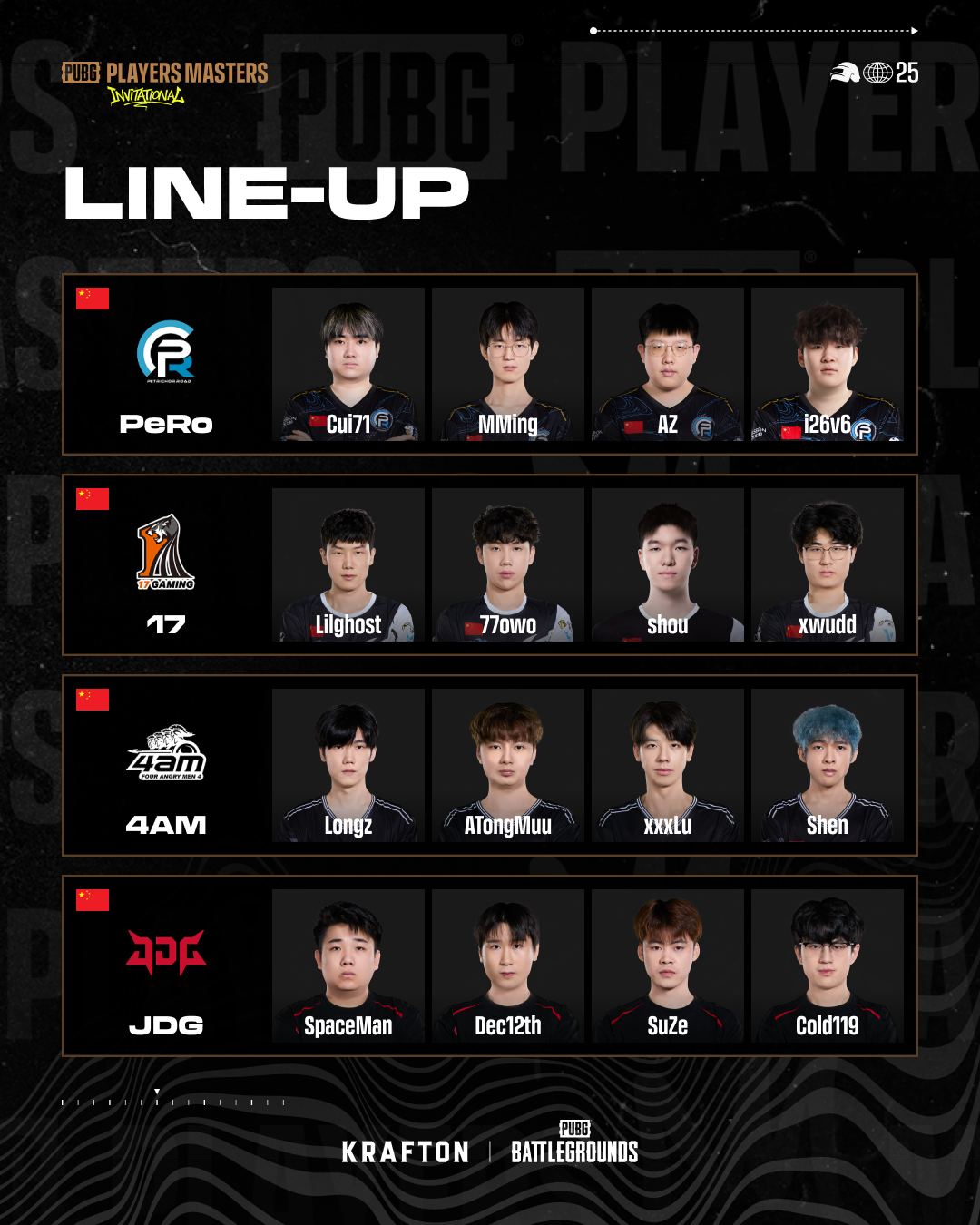 เรามีความยินดีอย่างยิ่งที่จะประกาศรายชื่อทีมและผู้เล่นทั้งหมดที่เข้าร่วมการแข่งขัน PUBG Players Masters Invitational