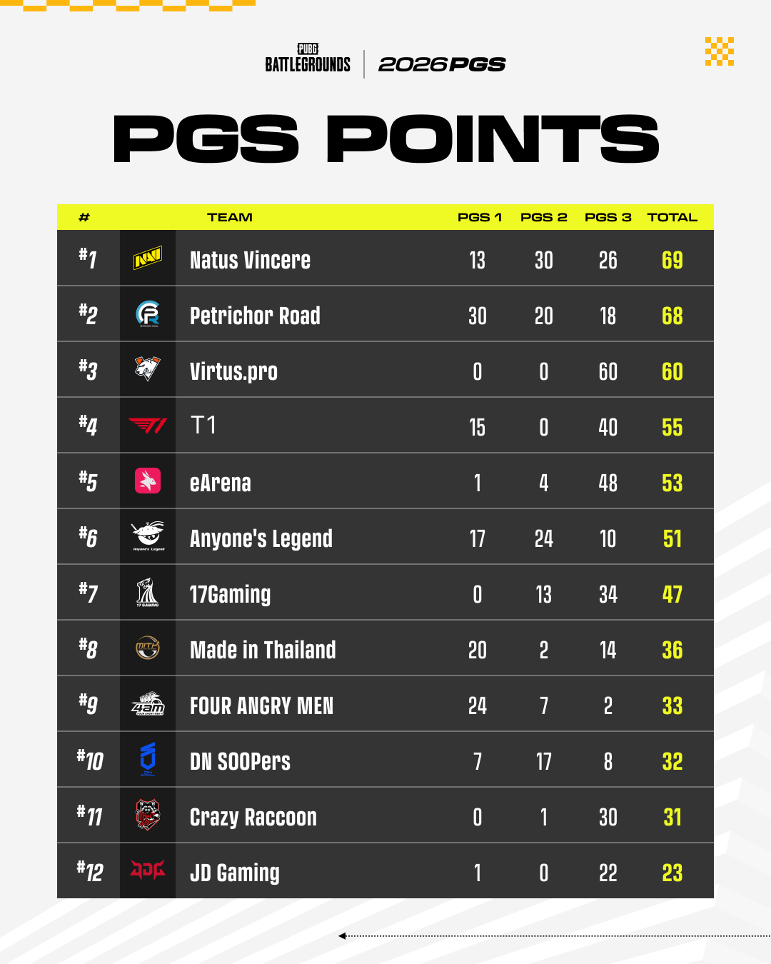 Yıllık PGS Puan yarışı devam ediyor — Circuit 2 sonuçları aynı zamanda PGC 2026'ya doğrudan katılım (ilk 8 takım) için önemli bir temel oluşturuyor.
