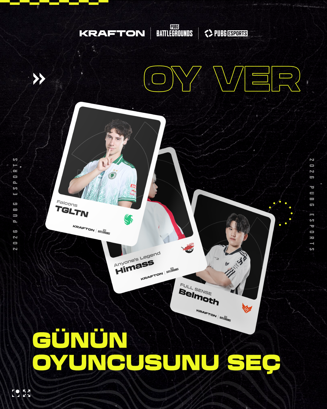 Sadece kazanan takımları değil, PUBG Esports’u unutulmaz kılan bireysel oyuncuları da kutlamak istiyoruz — ve bunun bir parçası olmanı istiyoruz. İster yıllardır takip ettiğin bir isim olsun, ister yeni keşfettiğin bir oyuncu, verdiğin oy onları sahnenin merkezine taşıyacak.