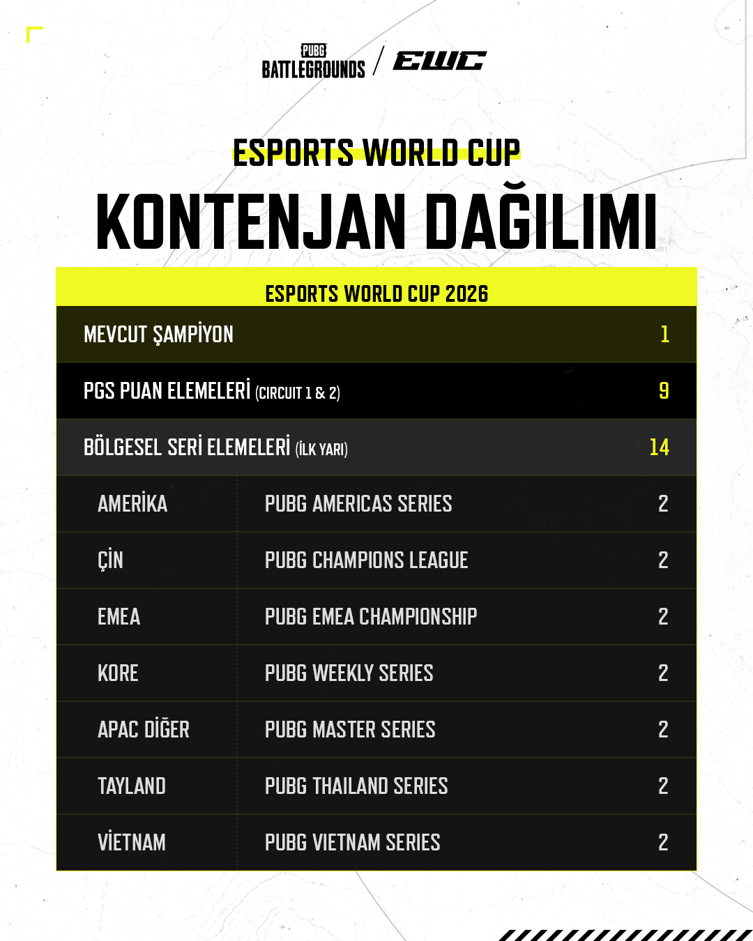 Esports World Cup (EWC), sezonun ilk yarısında önemli bir dönüm noktası olarak geri döner. Katılım, ilk yarı PGS Puanları ve Bölgesel Seriler sonuçlarına göre belirlenir. 2026 sezonunda EWC kapsamında PGS Puanı verilmez.