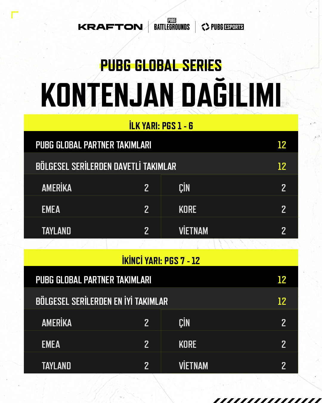 Her PUBG Global Series etkinliğinde 24 takım mücadele eder. Ancak katılan takımlar, sezonun ilk ve ikinci yarısında değişir.