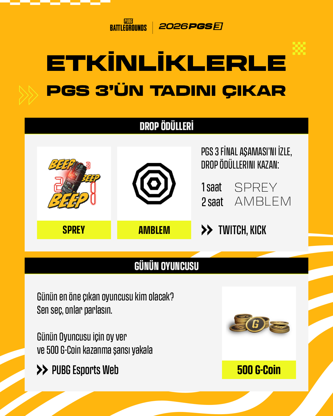 Canlı oylama sonuçları yayın sırasında paylaşılacak ve nihai sonuç, son maçın ardından PUBG Esports kanallarında açıklanacak.