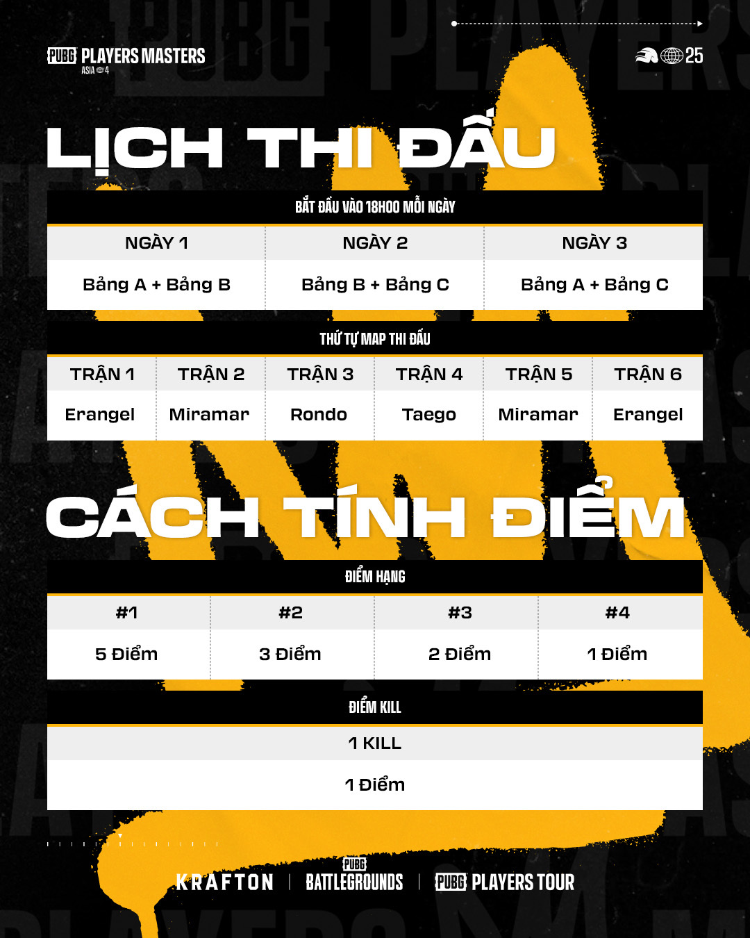 Giải đấu PUBG Players Masters 4 Asia (TPP) sẽ diễn ra trong 3 ngày, từ 03/10/2025 đến 05/10/2025 với sự góp mặt của 24 đội tuyển hàng đầu Châu Á.