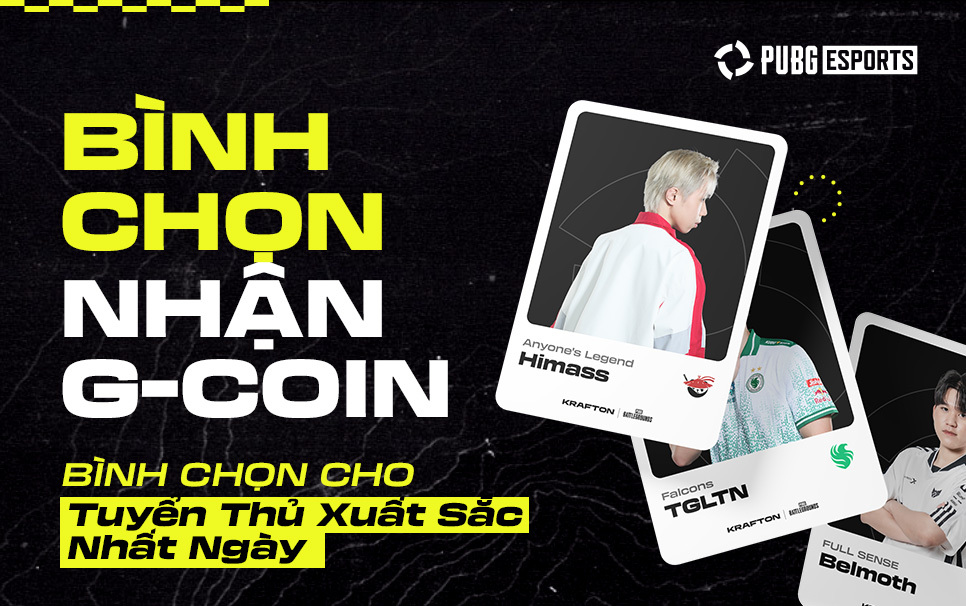 Ngày 2 - Vòng Chung Kết của PGS 1 | 17:00 ngày 22/03/2025 (Chủ Nhật) | 500 G-Coin (bốc thăm ngẫu nhiên trong số những người tham gia bình chọn) | Trên Website PUBG Esports |