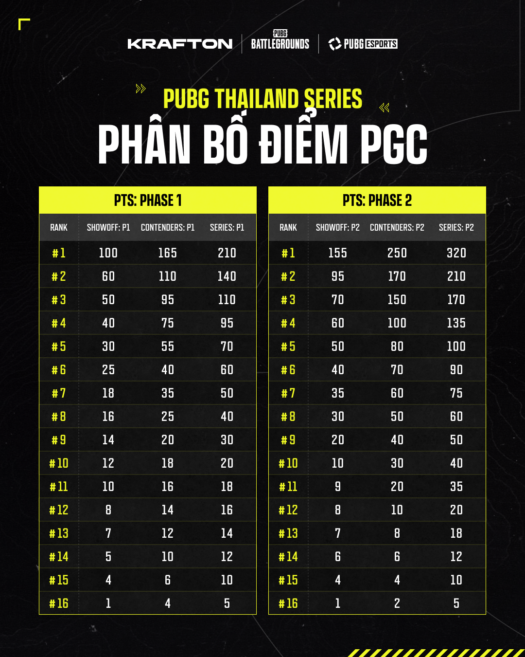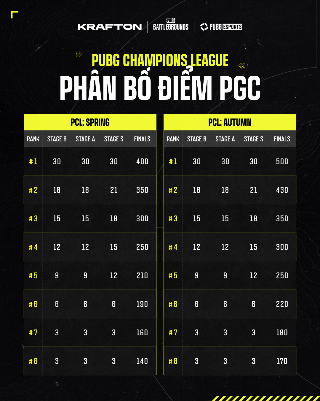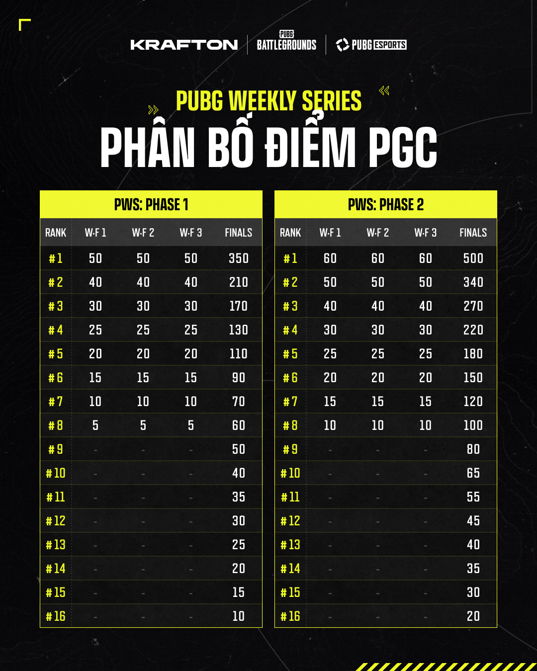 lĐiều kiện tham dự PUBG Global Championship: Top 8 đội có điểm PGS cuối cùng cao nhất (tích lũy từ PGS 1 → 12) sẽ tự động giành quyền tham dự PGC 2026. Xem phần phân bổ suất tham dự của PGC bên dưới để biết chi tiết đầy đủ.