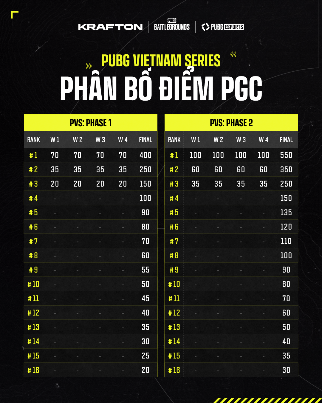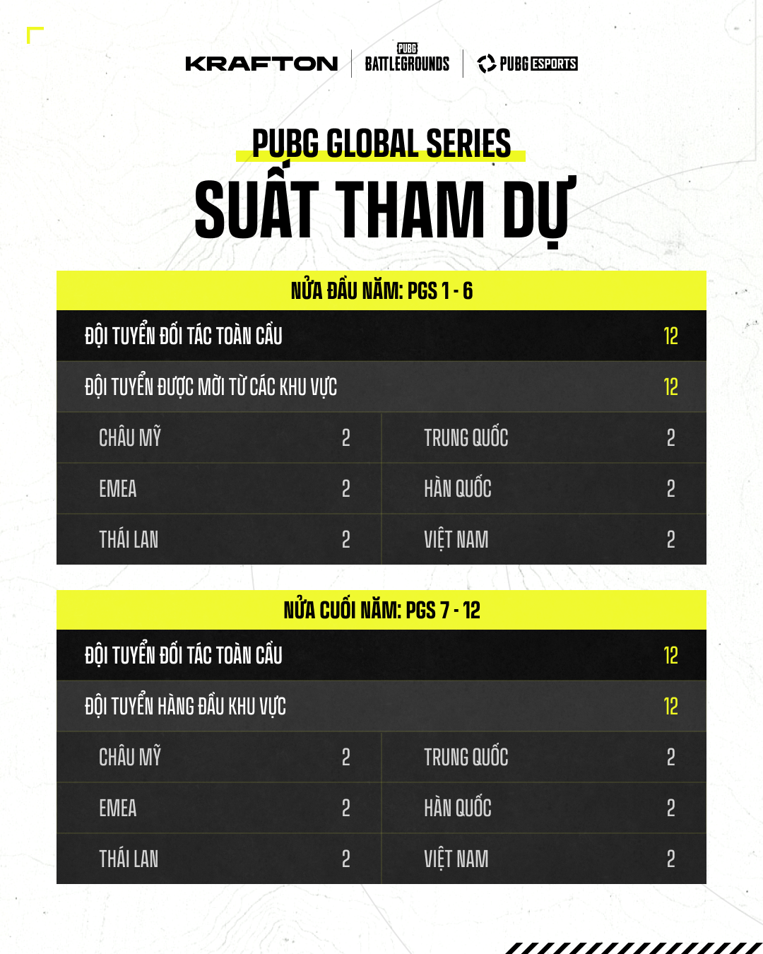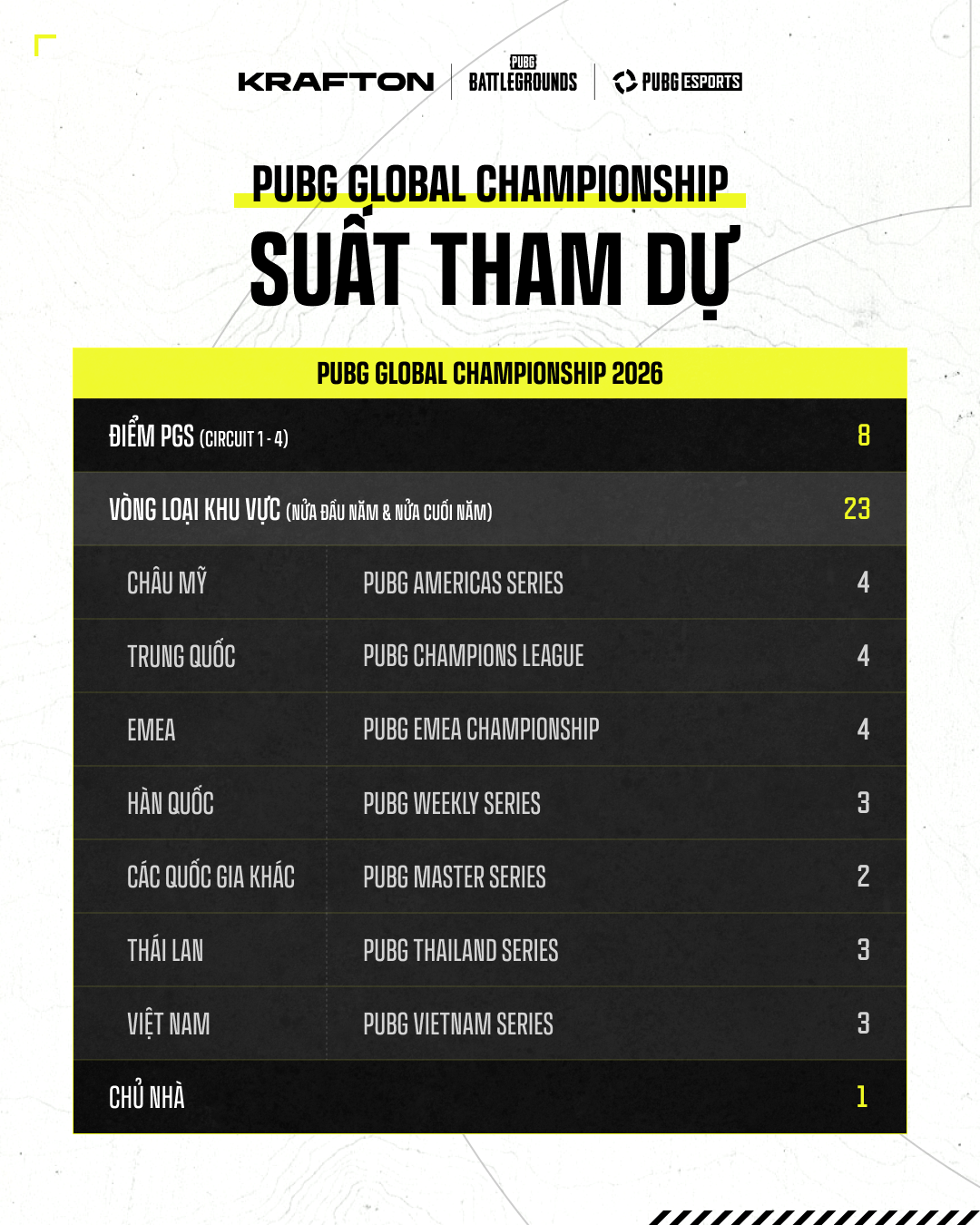 Điều Kiện Tham Dự: Dựa vào thành tích PGS 1 → PGS 6 (Circuit 1 & 2), Thành tích tại các Giải Đấu Khu Vực (Ở Việt Nam là dựa vào thành tích tại PUBG Vietnam Series Finals 2026 Phase 1)