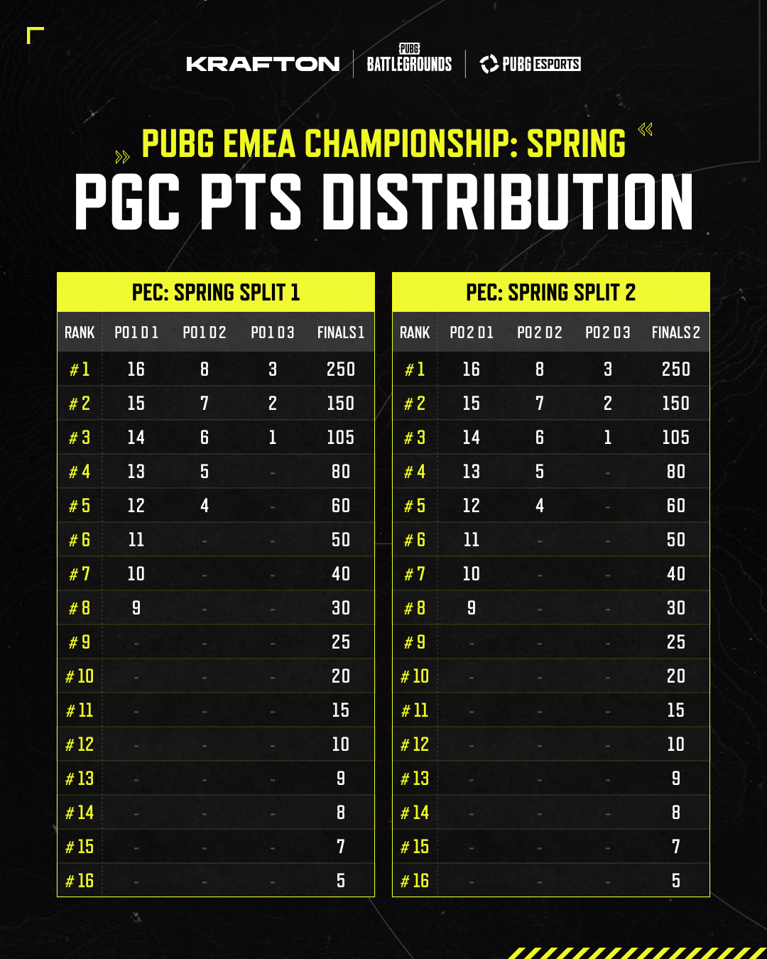 Điểm PGS quyết định việc đủ điều kiện tham dự Circuit Finals (PGS 3, PGS 6, PGS 9, PGS 12) và cũng được sử dụng để xét suất tham dự Esports World Cup và PUBG Global Championship.