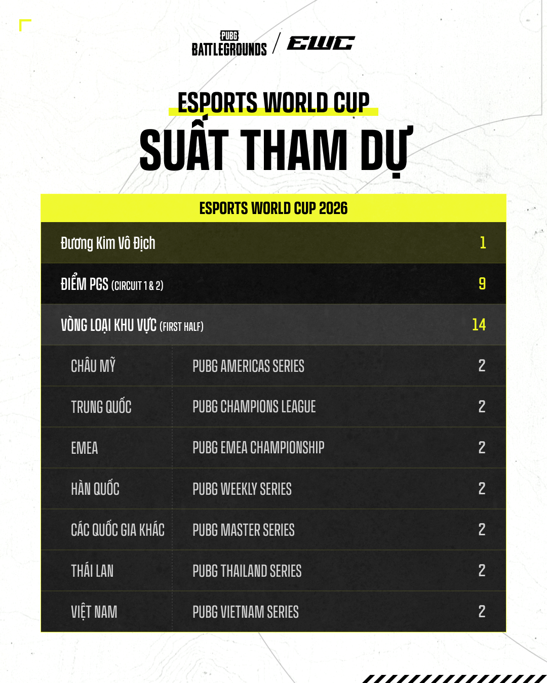.Esports World Cup (EWC) quay trở lại như một sự kiện lớn giữa mùa. Điều kiện tham dự dựa trên: Thành tích nửa đầu mùa tại PGS (PGS 1 → PGS 6) và Thành tích tại các Giải Đấu Khu Vực (Ở Việt Nam là dựa vào thành tích tại PUBG Vietnam Series Finals 2026 Phase 1)