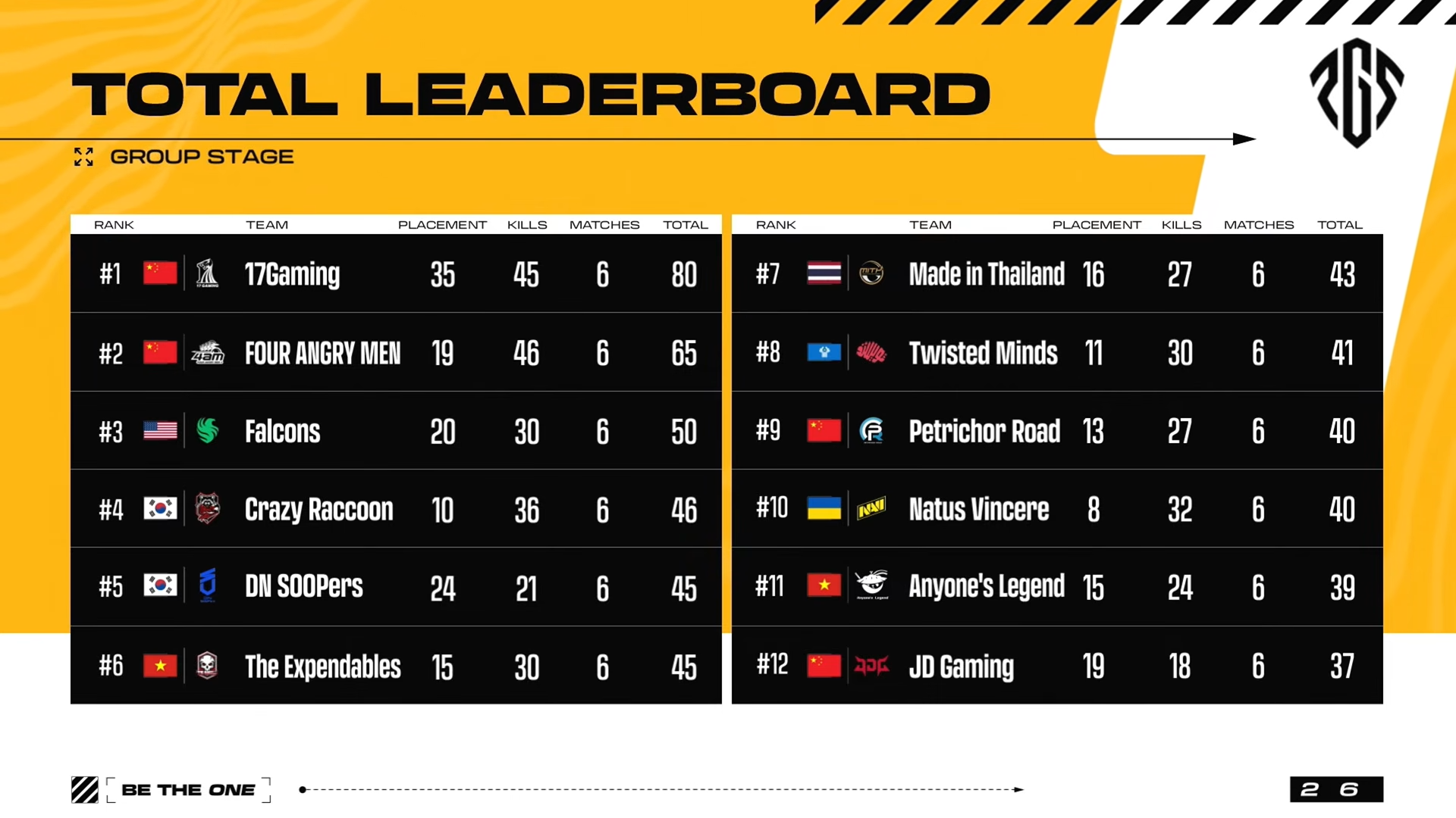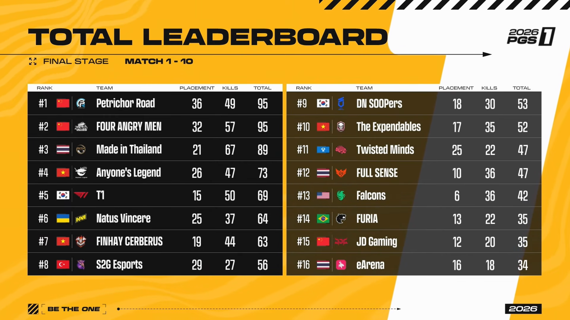 Petrichor Road và Four Angry Men cùng đạt 95 điểm, nhưng Petrichor Road giành chức vô địch nhờ tie-break. Made in Thailand xếp hạng 3 với số kills cao nhất Vòng Chung Kết (67 kills).