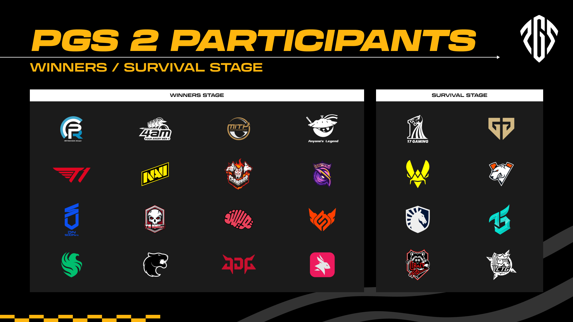 Các đội bị loại (8 đội) - Bao gồm 17Gaming (top Vòng Bảng) và Gen.G Esports (đội mạnh năm 2025). Họ sẽ bắt đầu từ Vòng Sinh Tồn tại PGS 2 và phải chiến đấu sinh tồn trong 1 ngày duy nhất.