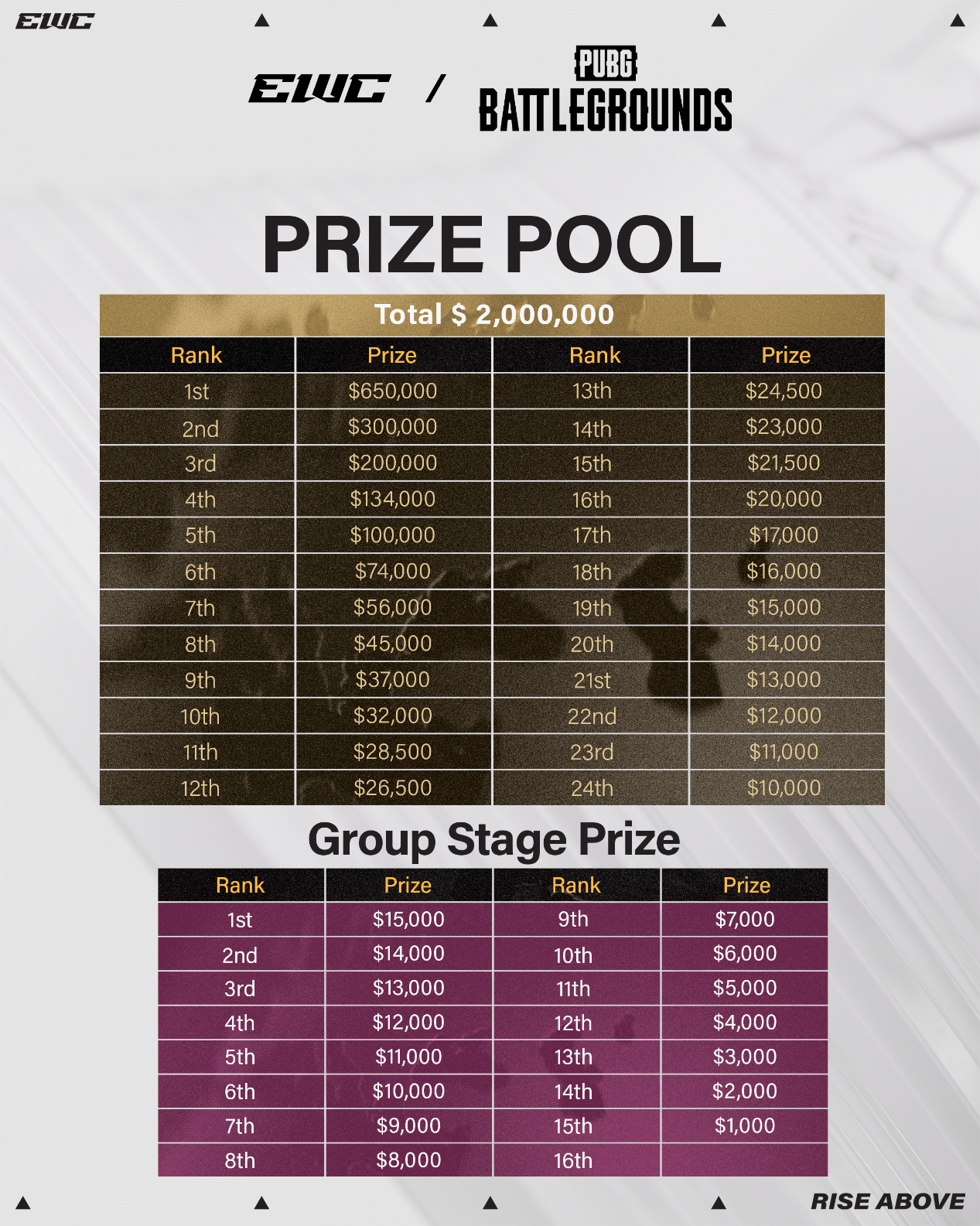 EWC x PUBG 的总奖金池高达惊人的 2,000,000 美元,将根据队伍的最终排名进行分配。