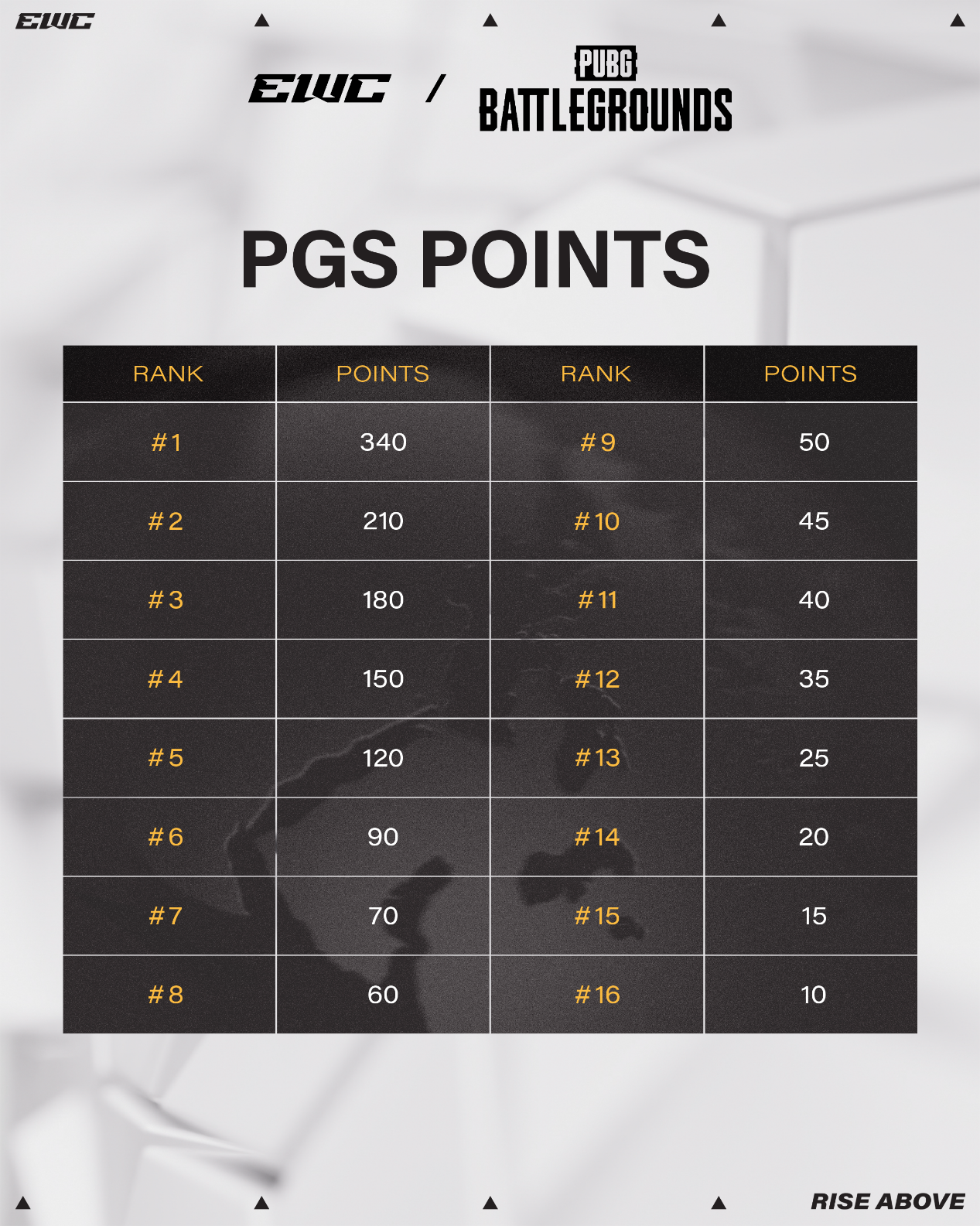 战队将根据其最终排名获得相应积分。详情请参阅我们的公告:【2025PGC之路——PUBG电竞积分分布】