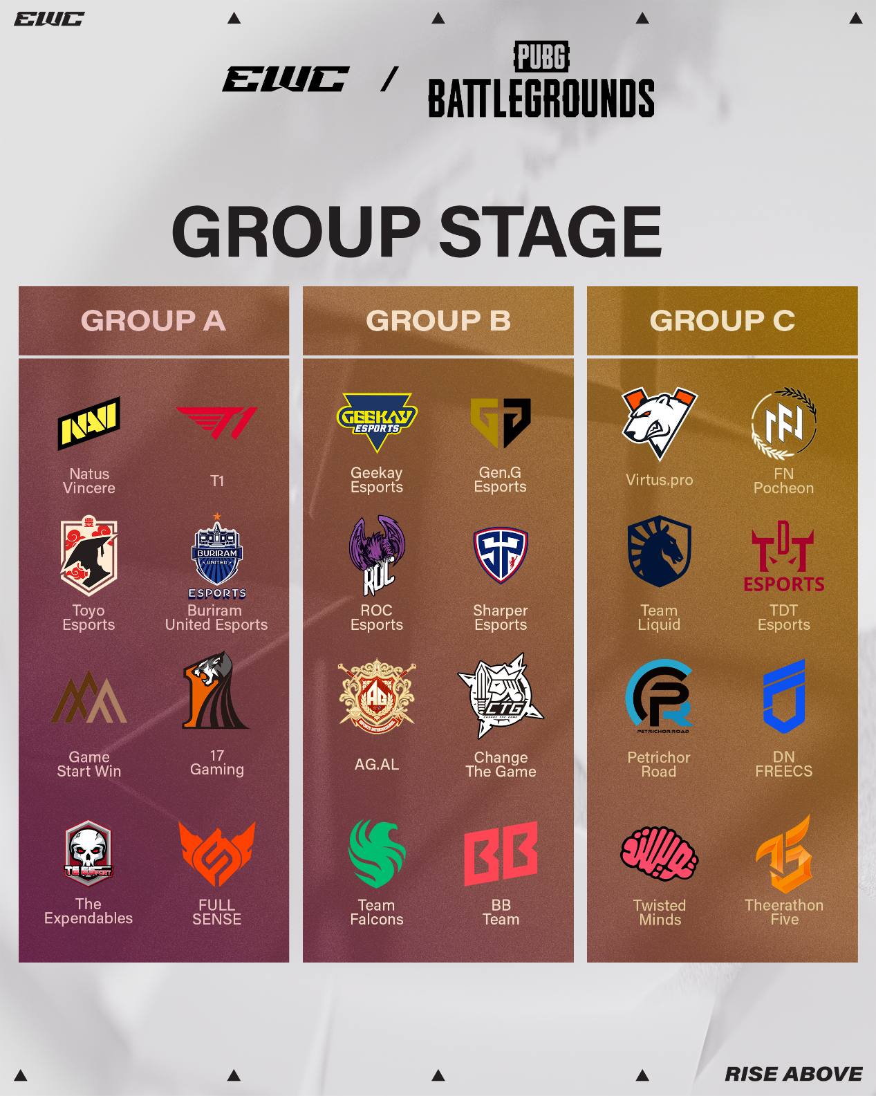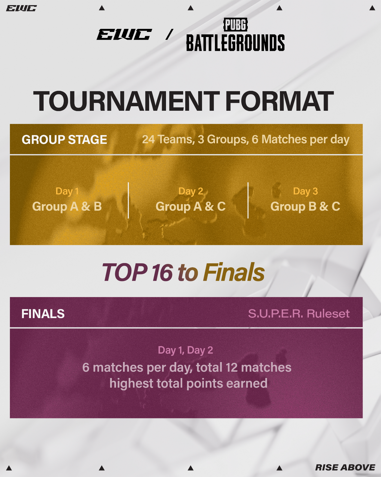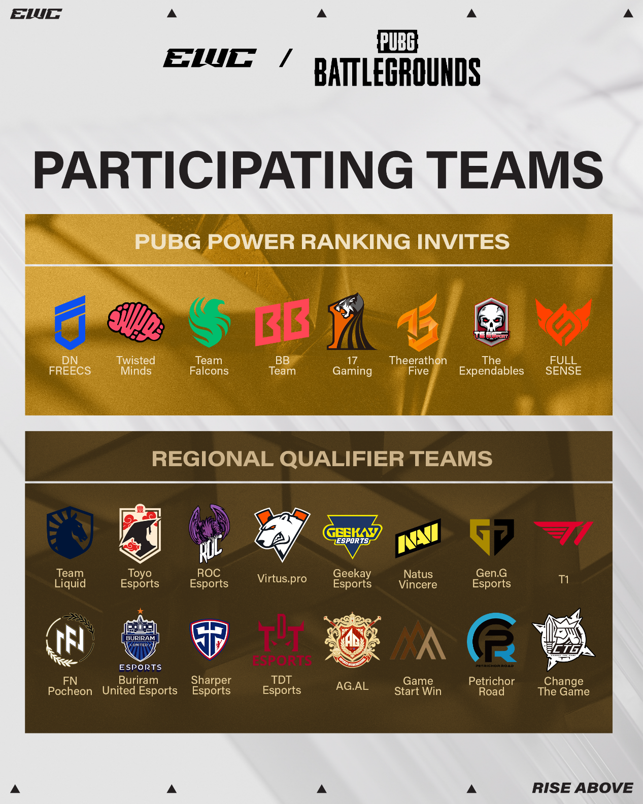 其中8支队伍通过PUBG Power Ranking获得直邀资格,另外16支队伍则通过地区预选赛脱颖而出。