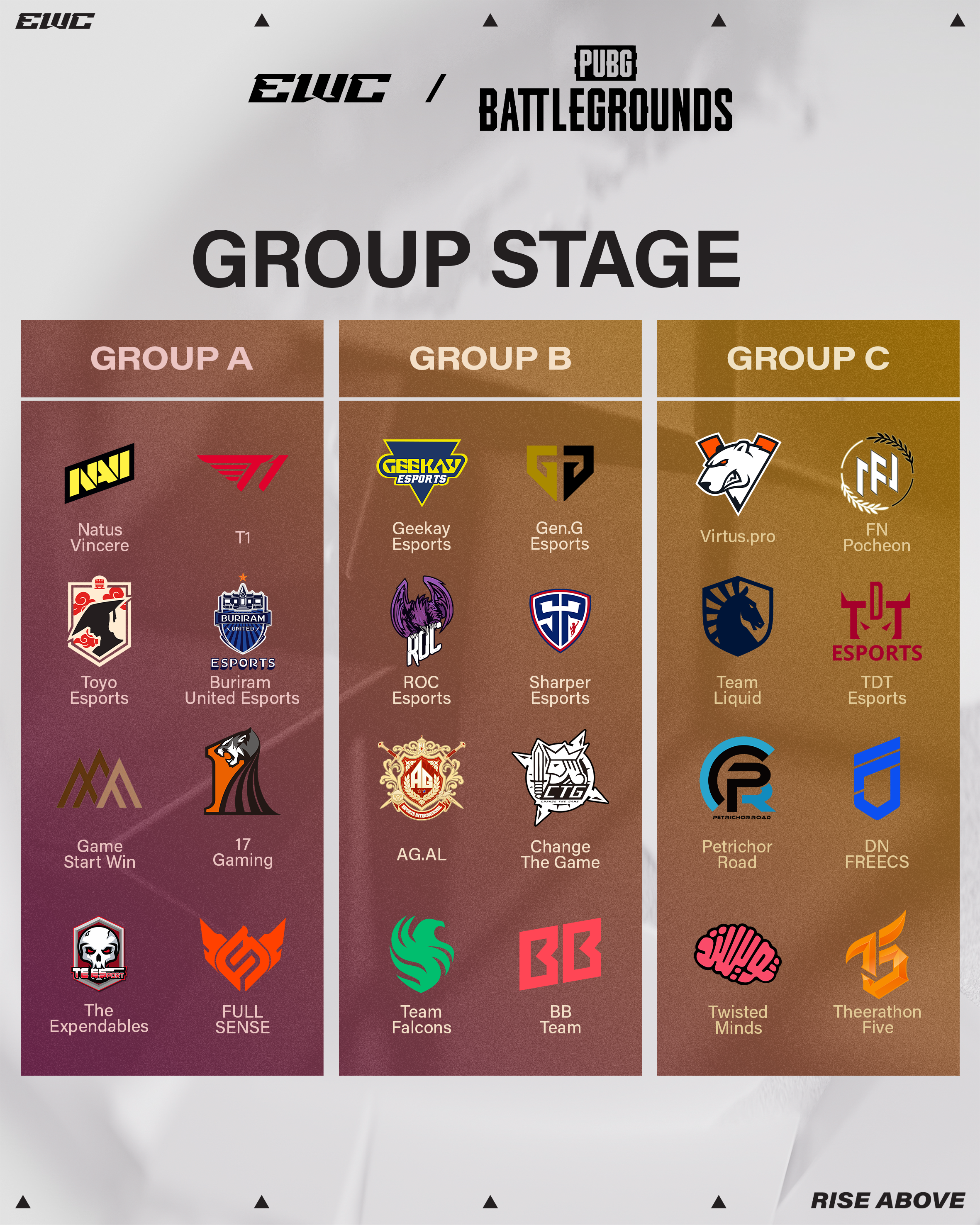 本次 EWC: PUBG 賽事共 24 支隊伍參賽: