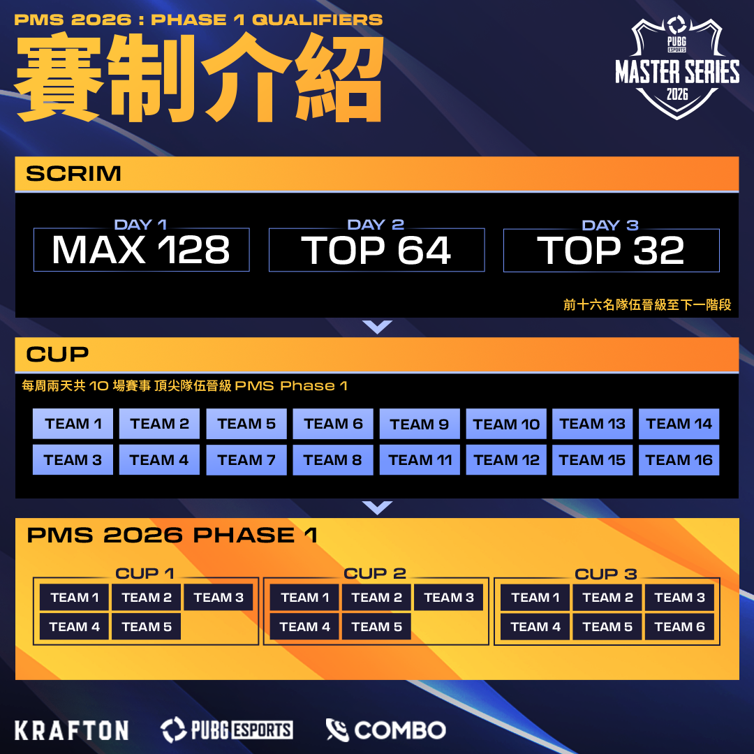 PMS: Scrim 1~3:每週平日舉行,所有符合資格的玩家皆可參加,16 支隊伍將晉級至 Cup。